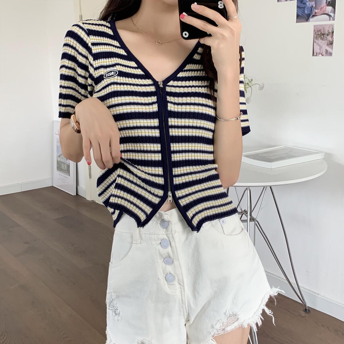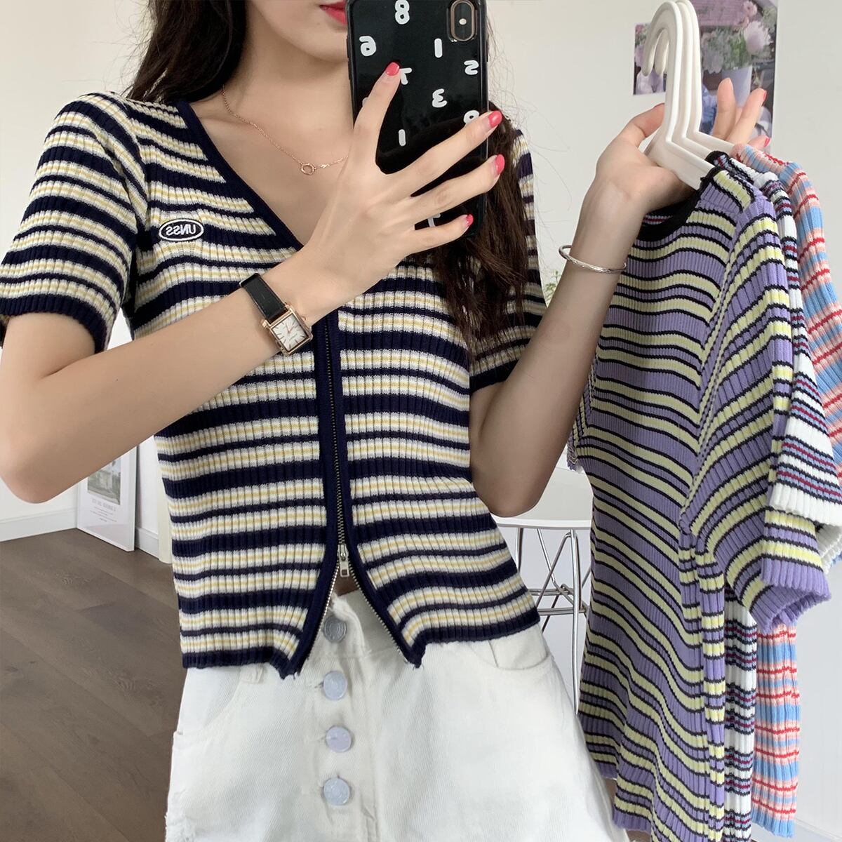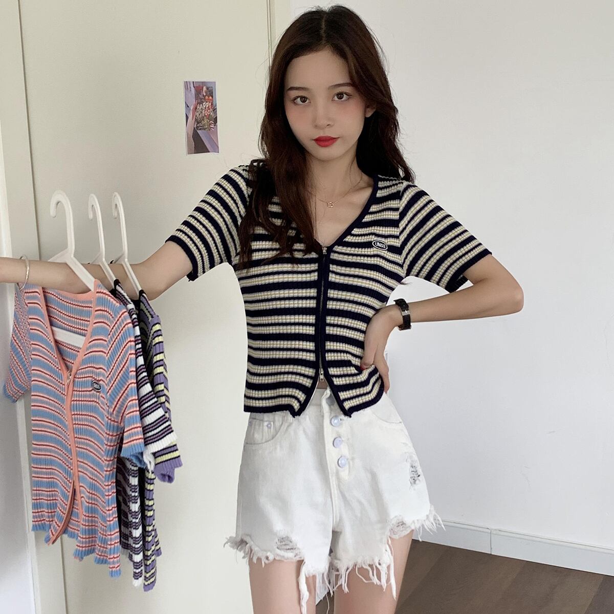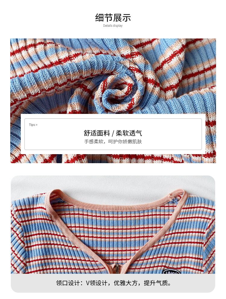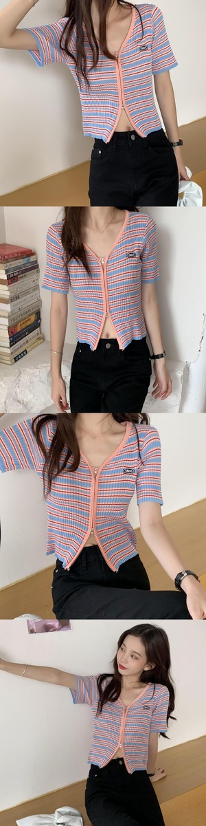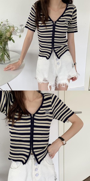 スリムニットセーター サマーショートスタイルVネックストライプジッパーカーディガントップス 夏物 クレセントシティ88708388216