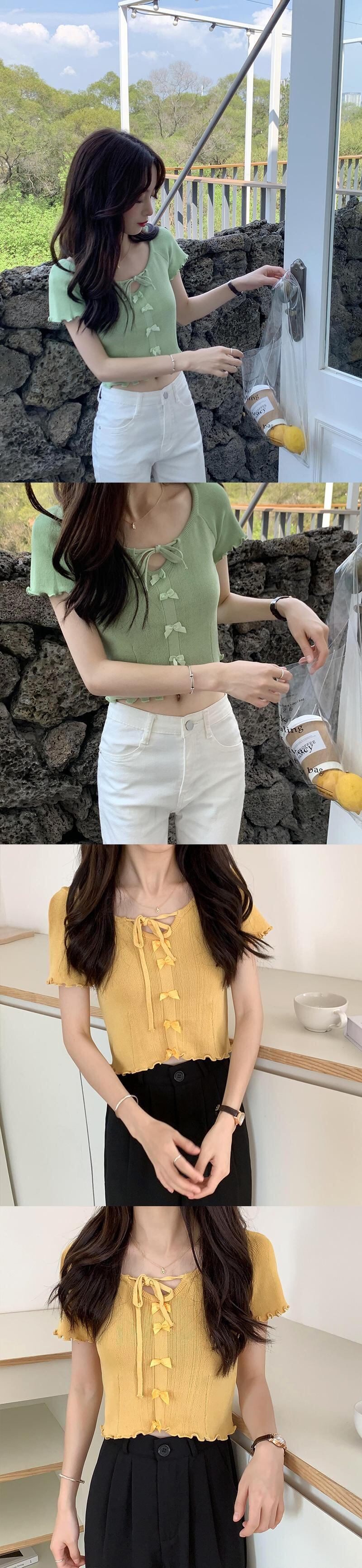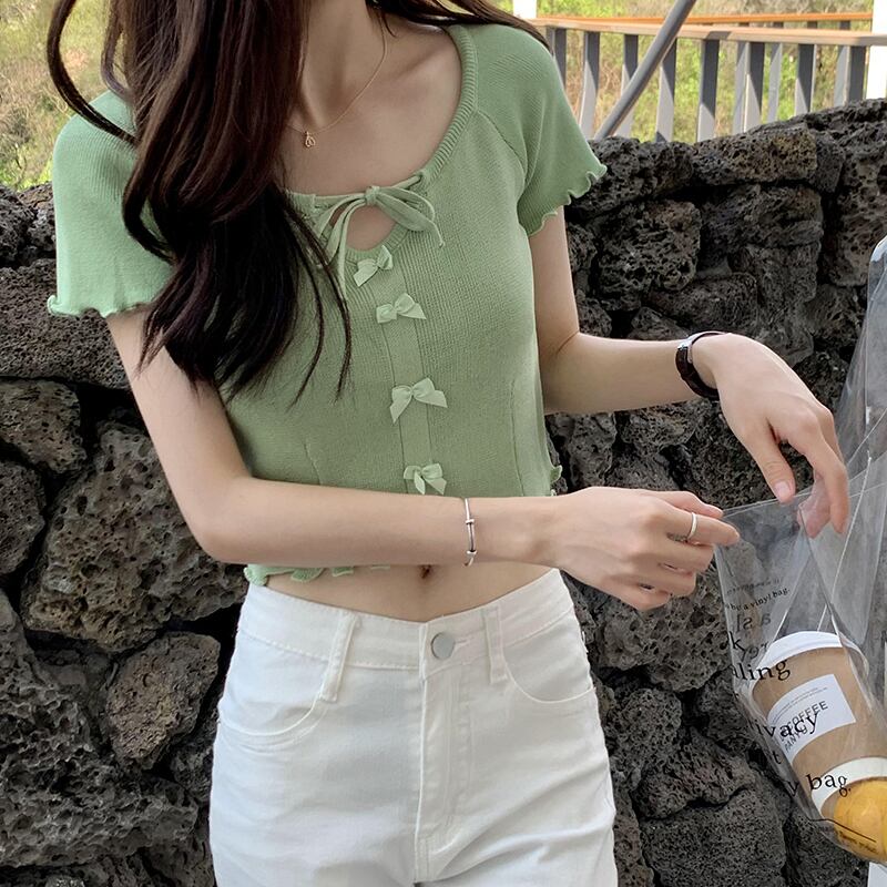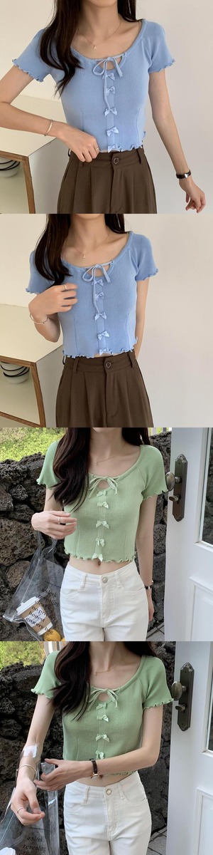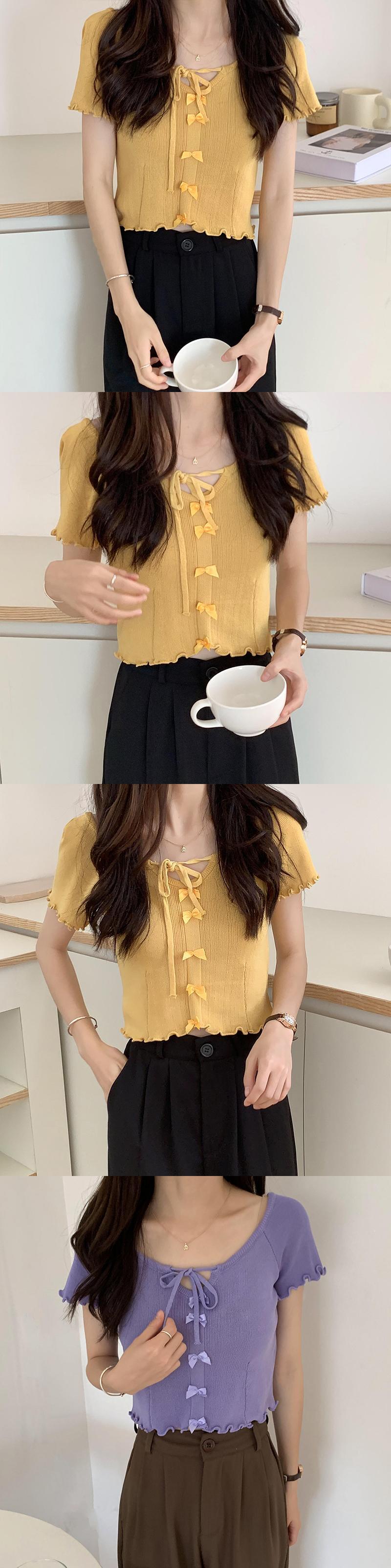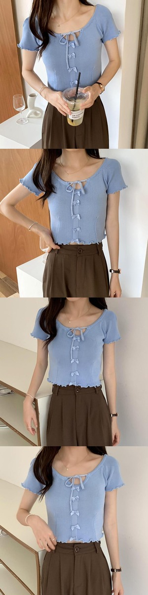 ショートTシャツ サマーリボンカラーニットトップス 大人ガーリー スウィート キュート カジュアル 夏物 ピュア クレセントシティ98168178547