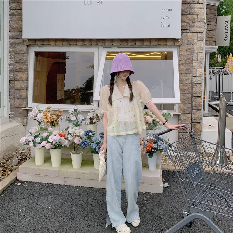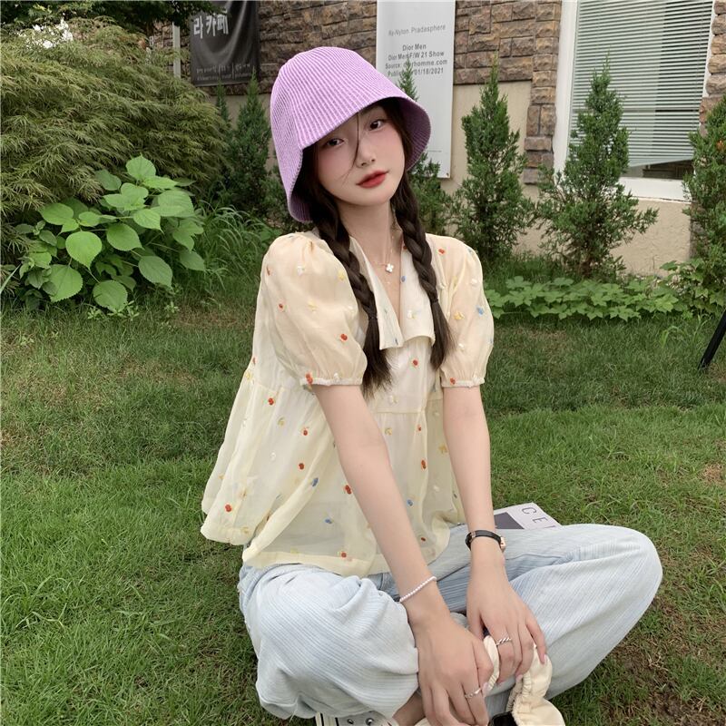 薄手スリーブシャツ サマーブラウス レッド 刺繍 大人ガーリー スウィート キュート カジュアル 夏物 クレセントシティ70338459704