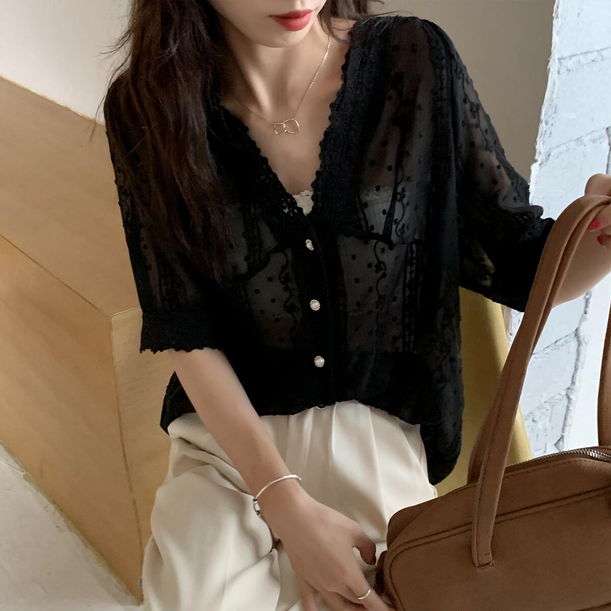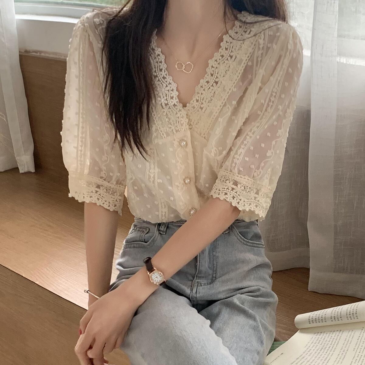 レースシャツ サマーVネックルーズ 大人ガーリー スウィート キュート カジュアル 夏物 クレセントシティ81687830863