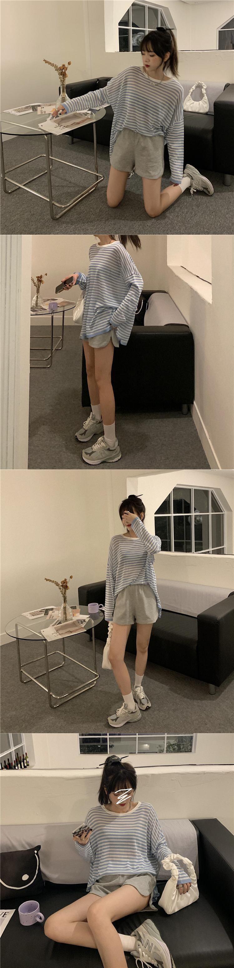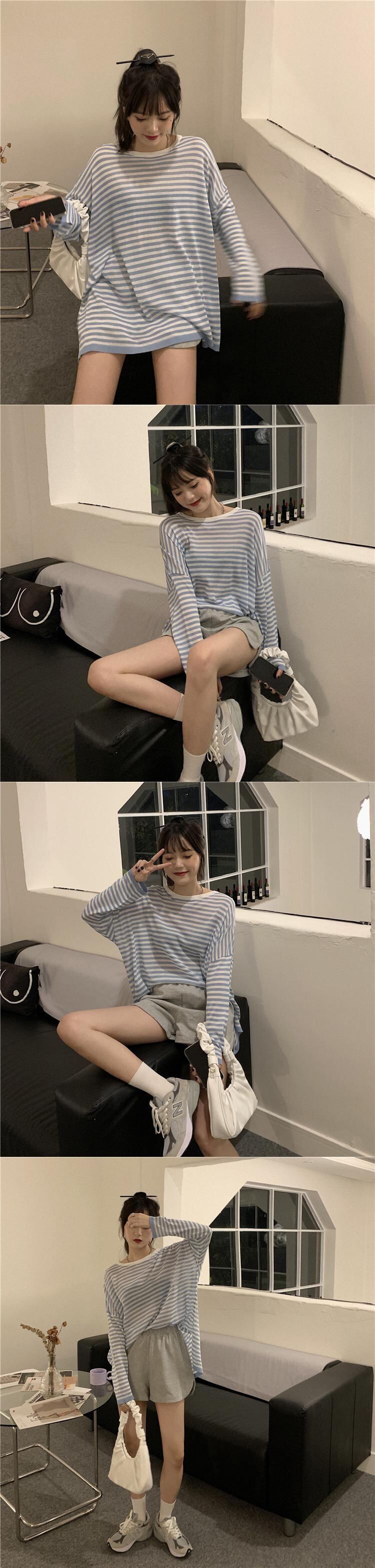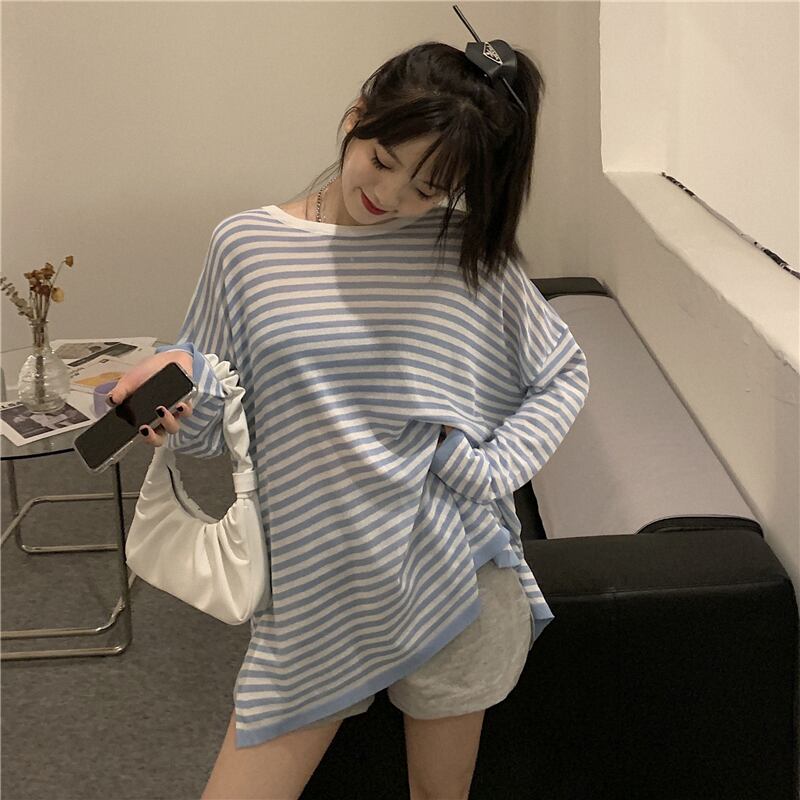 ルーズストライプTシャツ オータムスタイルカジュアルニットトップス ロング 秋物 クレセントシティ73354090404