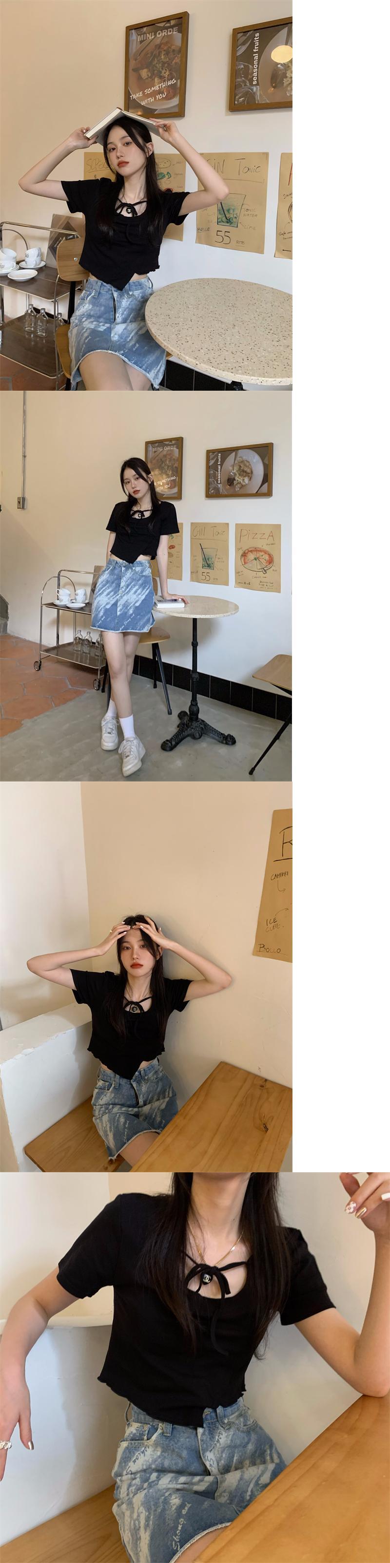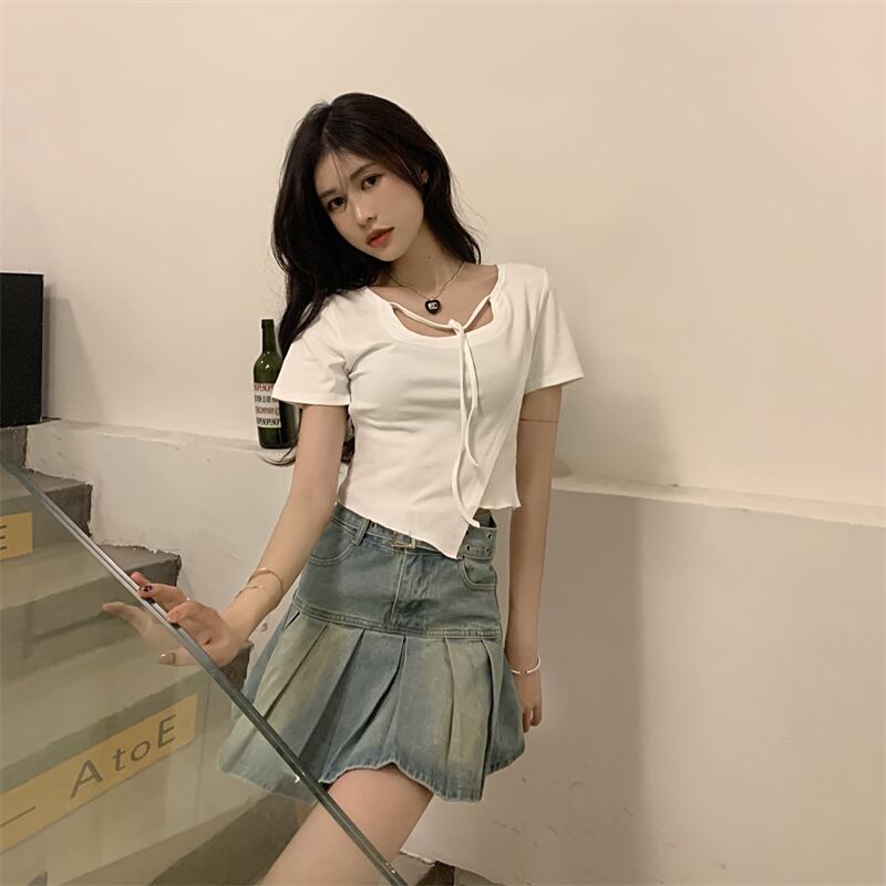 ショートTシャツ サマースリムトップス レース 夏物 レースアップ クレセントシティ20512684165