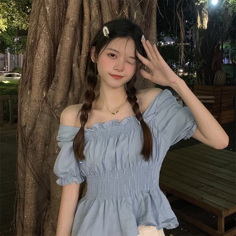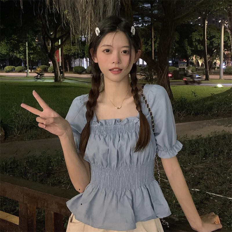 カラーブラウス サマースタイルスリムウェストスリーブシャツ レディース 夏物 スクウェア クレセントシティ81803269983