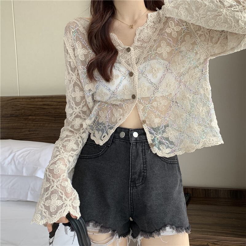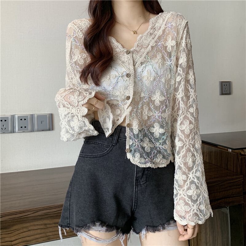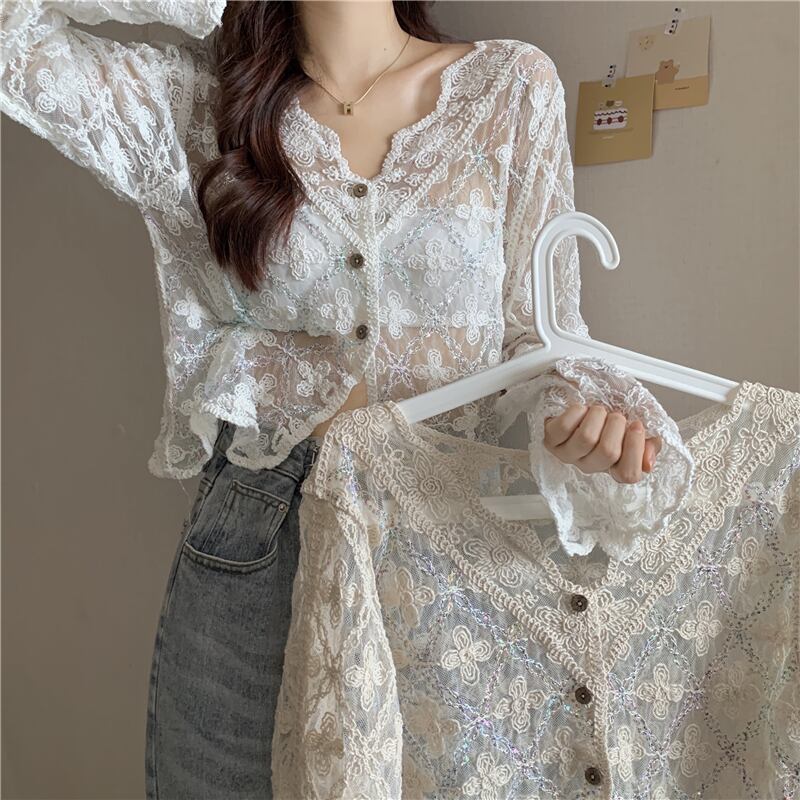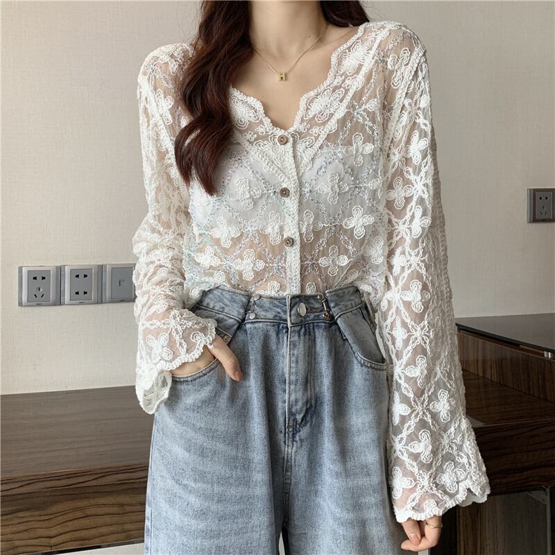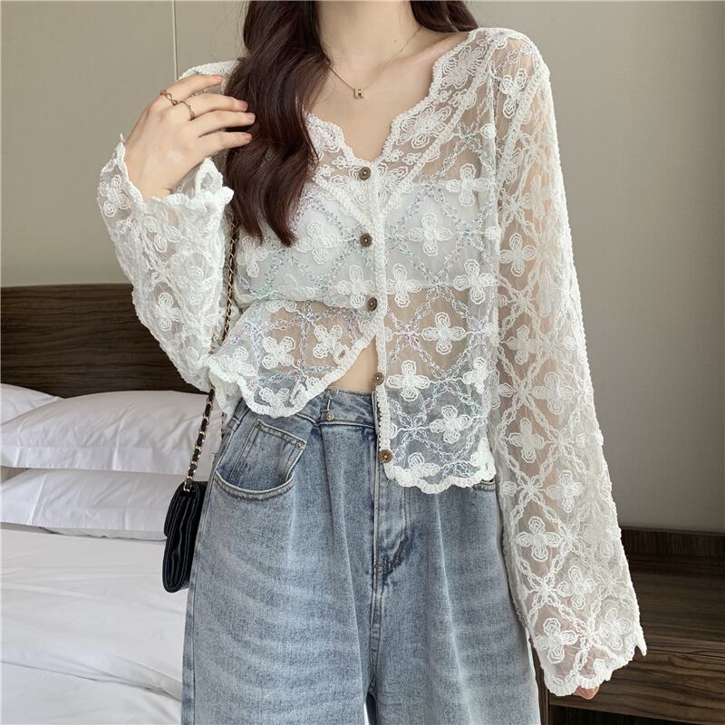 スタイルレースシャツ レディースサマー薄手Vネックカーディガントップス ロング 夏物 クレセントシティ64814932172
