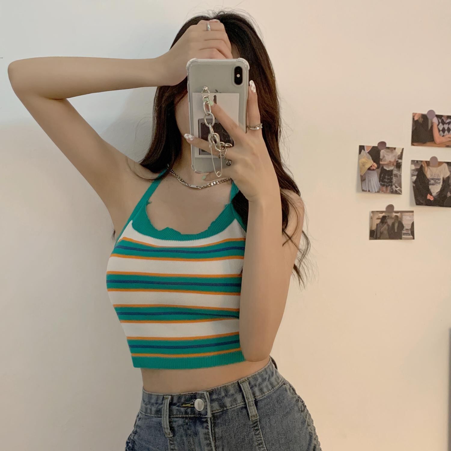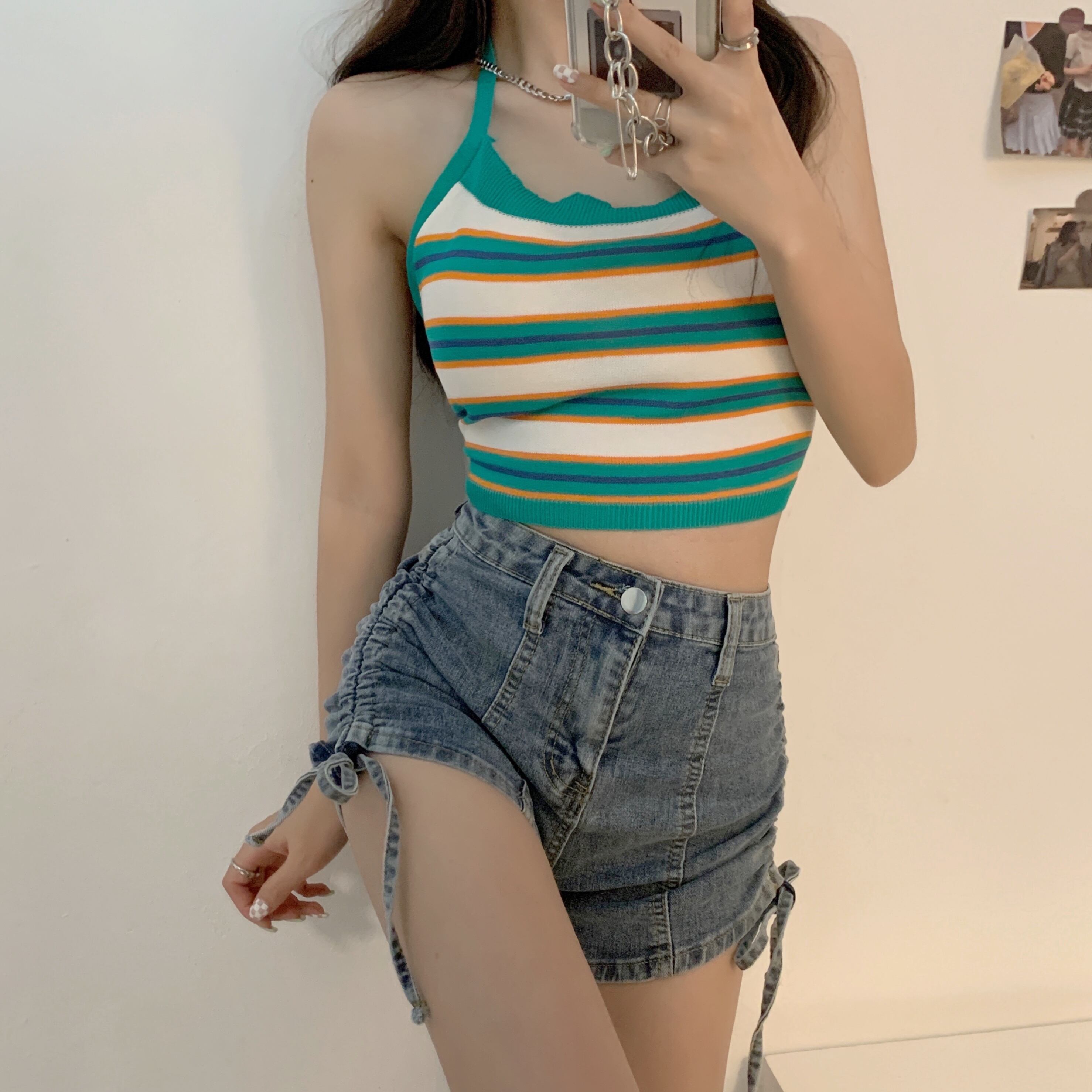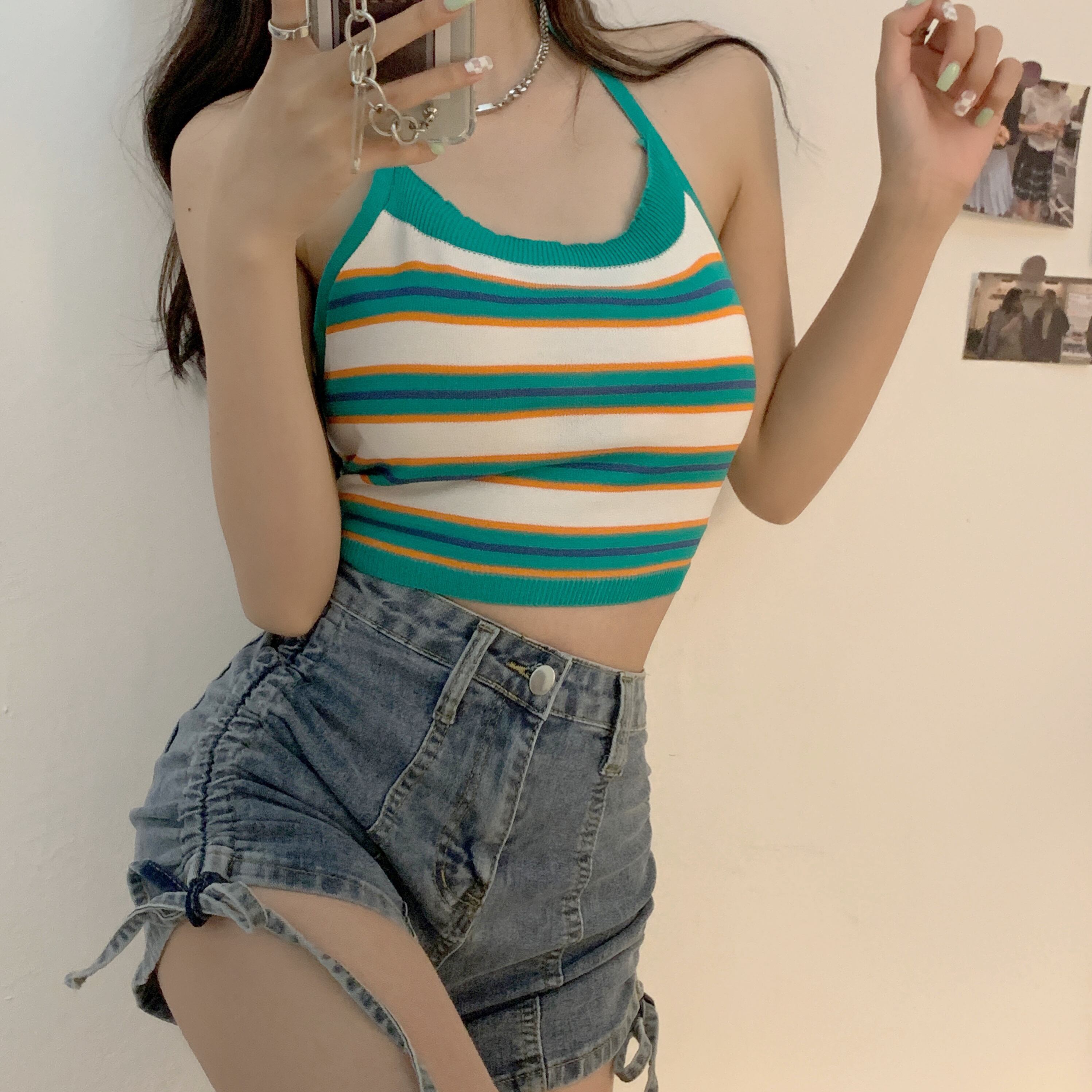 ホルターサマースリムショートストライプニットトップス 夏物 クレセントシティ8921637856