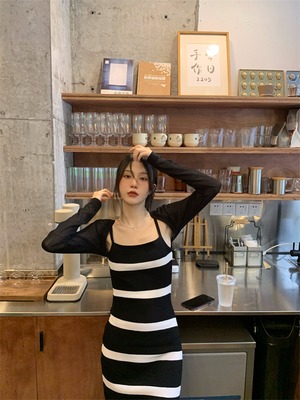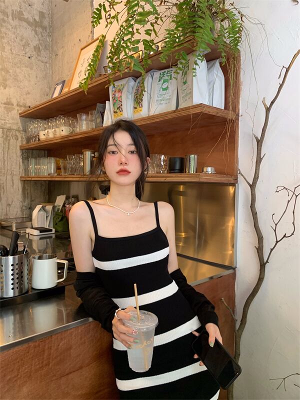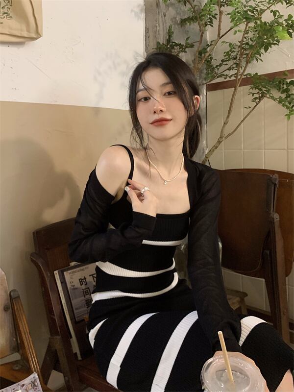 色:黒のブラウス,縞模様のドレス