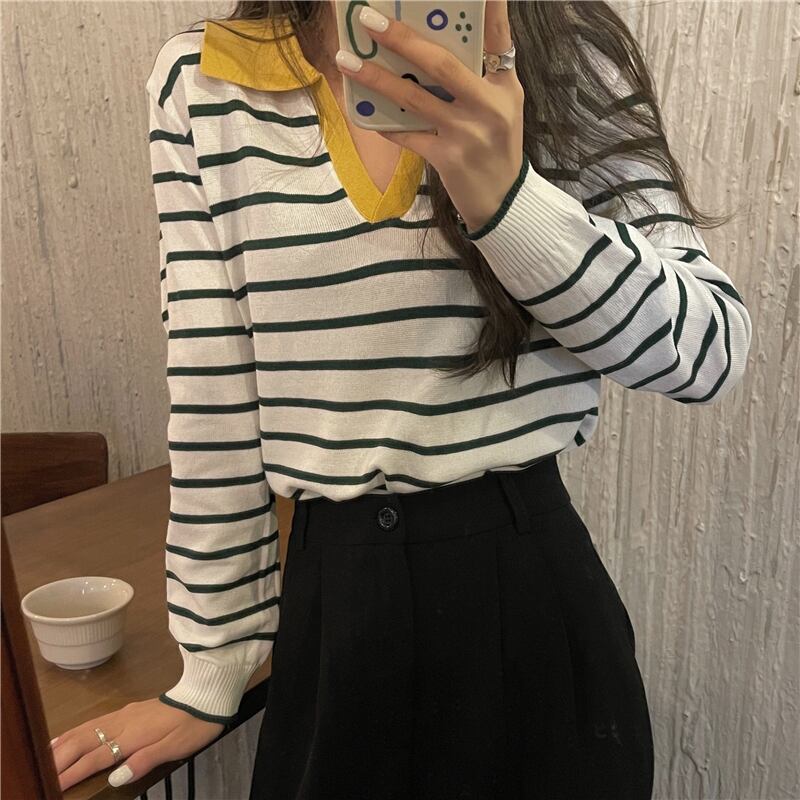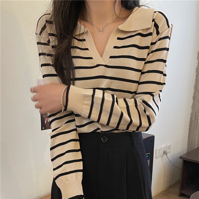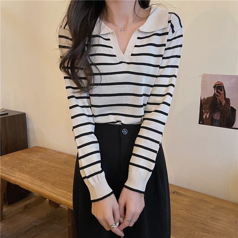 ストライプシャツ オータムTシャツ ルーズニットトップス ロング 秋物 クレセントシティ81296088157