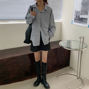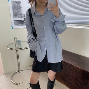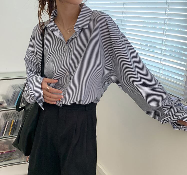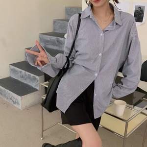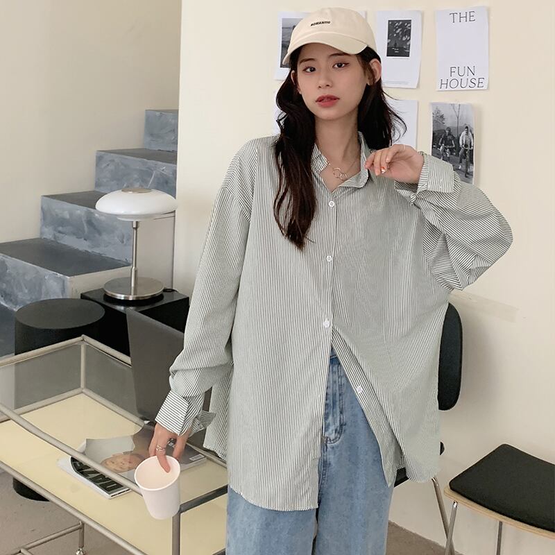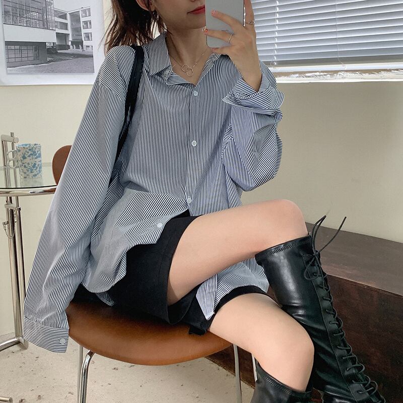オータムストライプシャツ スタイルルーズカジュアル ロング 秋物 クレセントシティ65525633063