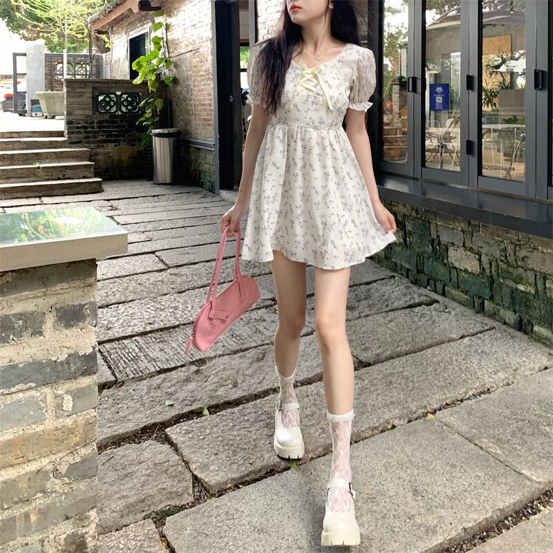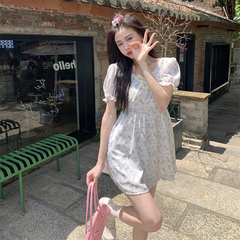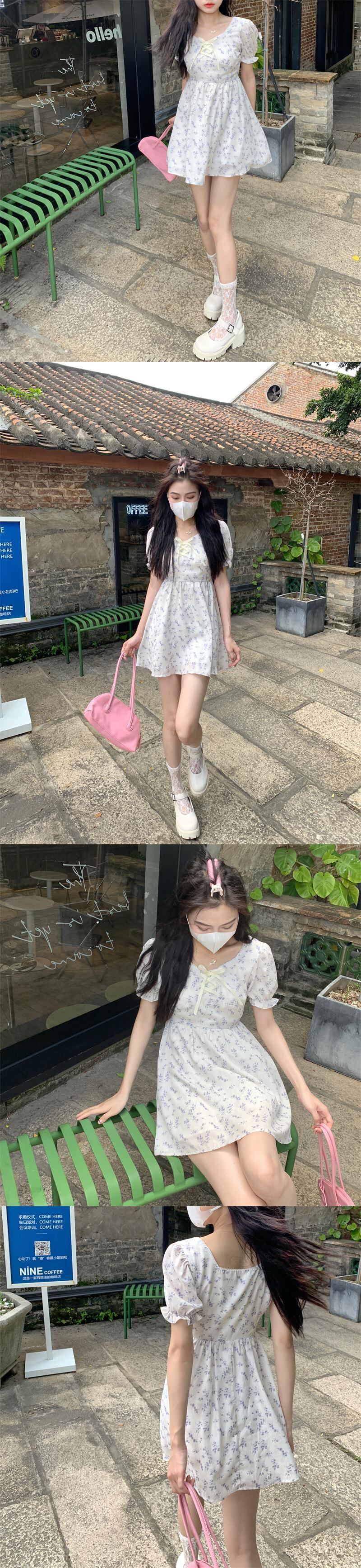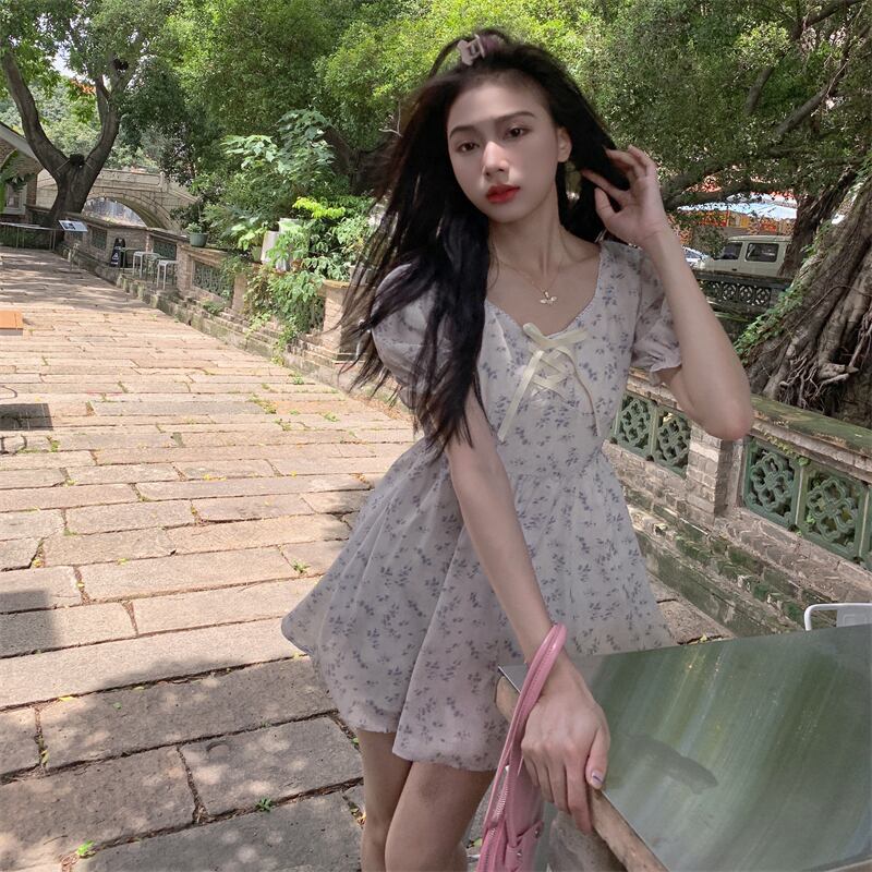 フローラルドレス サマースリーブウェストシフォンスカート 大人ガーリー スウィート キュート カジュアル 夏物 花柄 クレセントシティ73389331786