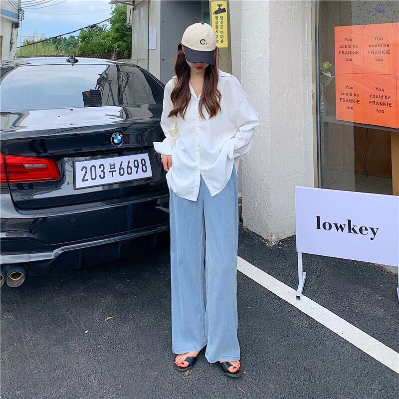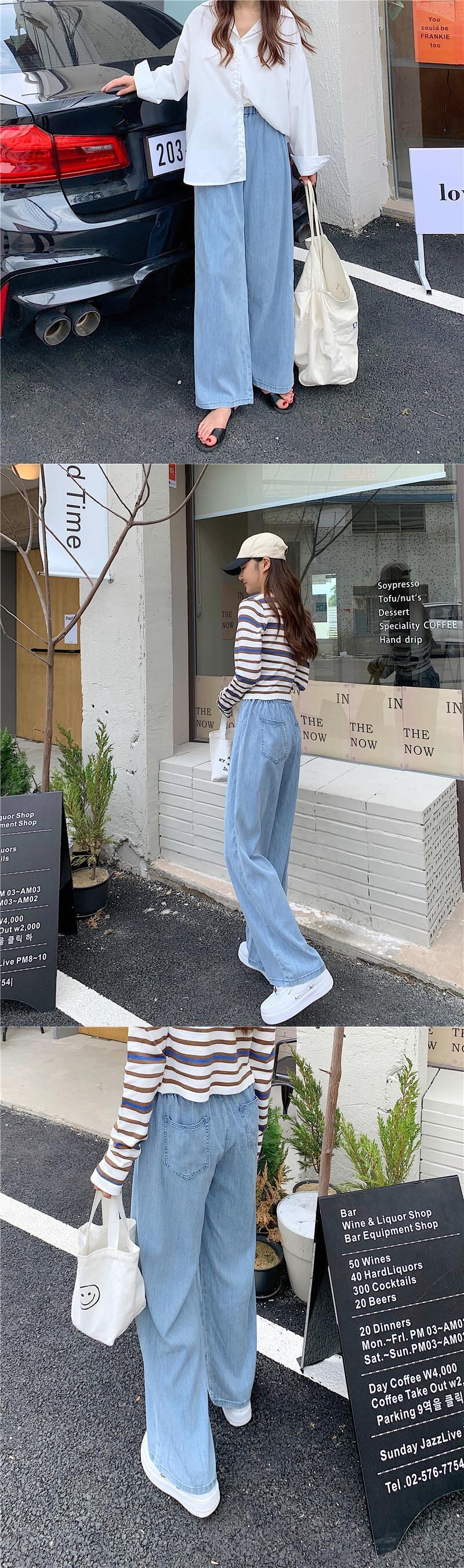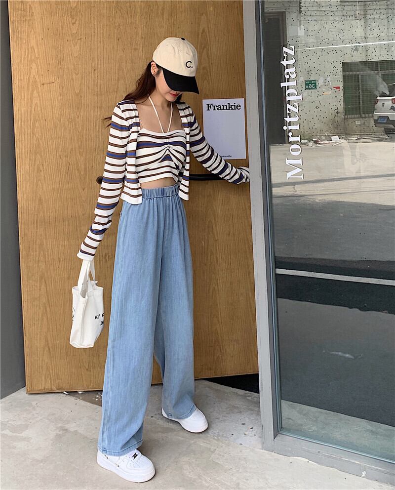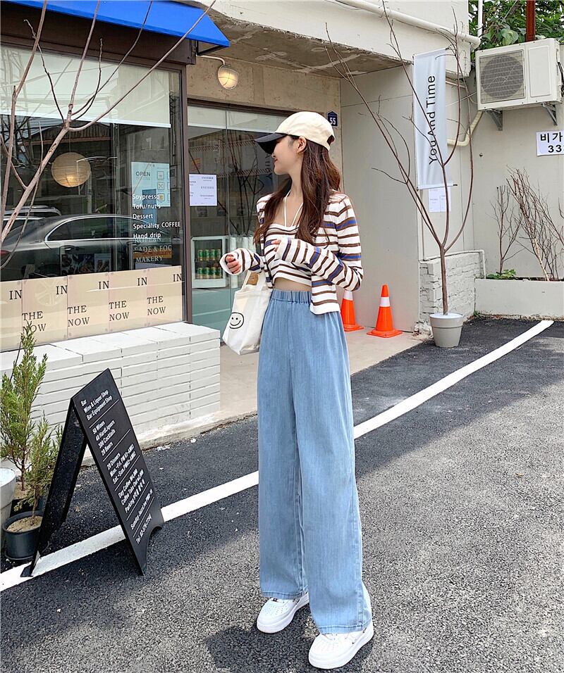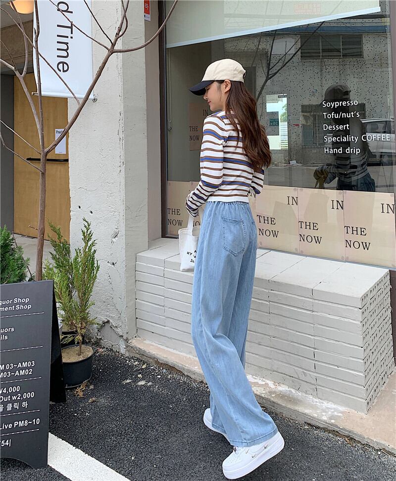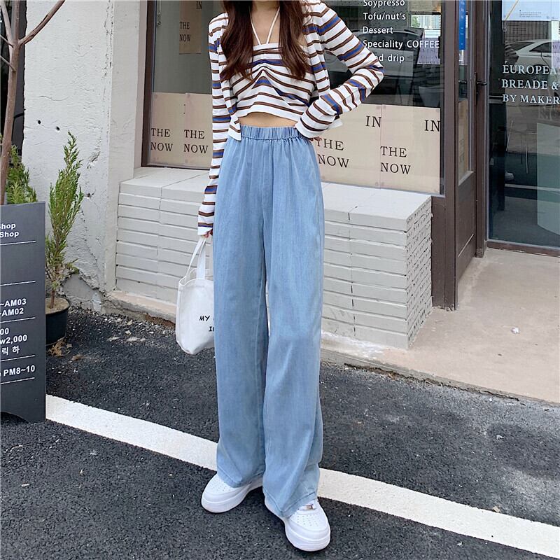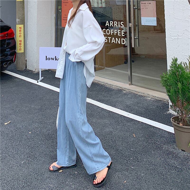 薄手ルーズジーンズ レディースサマーストレッチハイウェストウェストワイドレッグパンツ エラスティック 伸縮 夏物 ワイドパンツ クレセントシティ86468845886