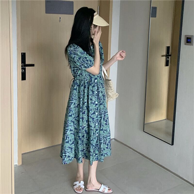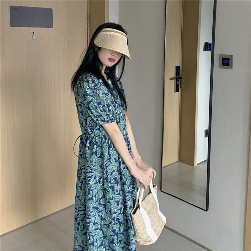 スタイルフローラルドレス サマースタンダードスリーブウェストロングスカート レトロ 夏物 花柄 クレセントシティ79327803532