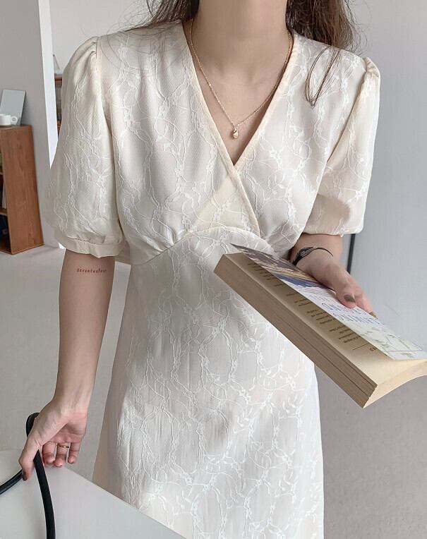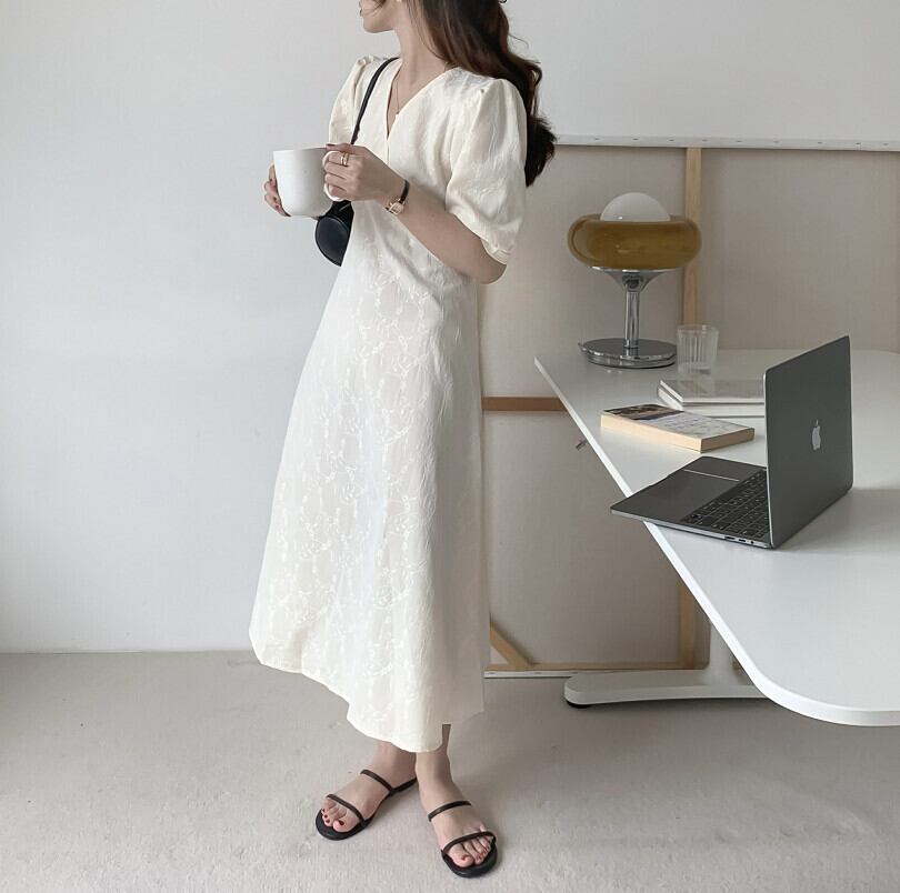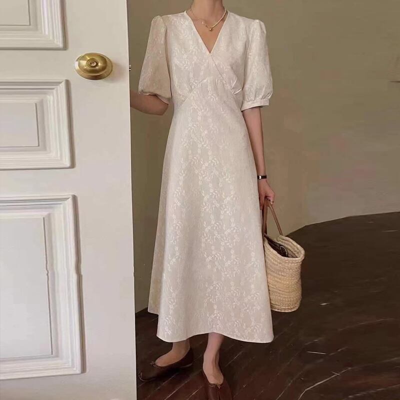 Vネックドレス サマースタイルロングAラインスカート 夏物 クレセントシティ93556291545