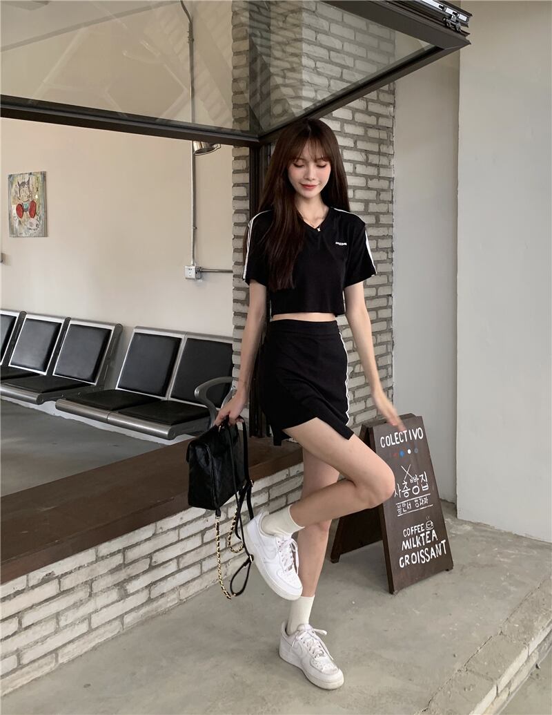 サマーブラックストライプショートTシャツ ハイウェストウェストAラインスカート 夏物 クレセントシティ21353816527