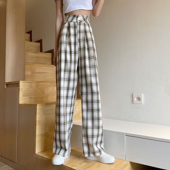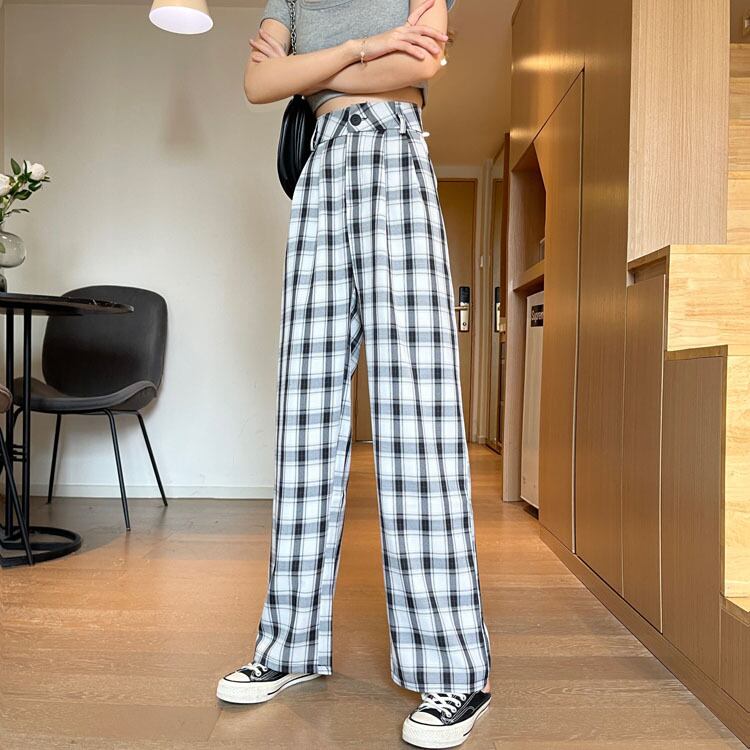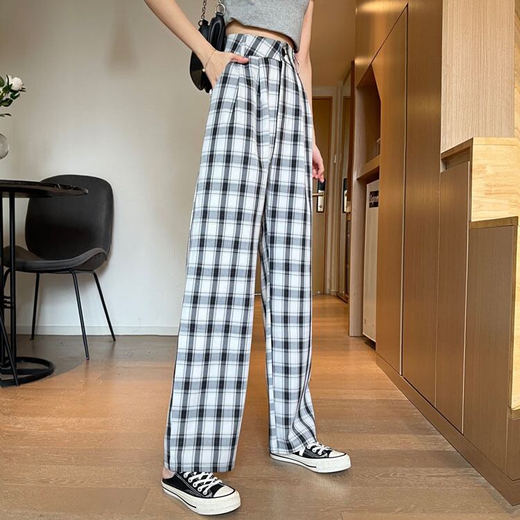 格子柄カジュアルパンツ サマースタイルルーズハイウェストウェストロング 夏物 クレセントシティ12302855994