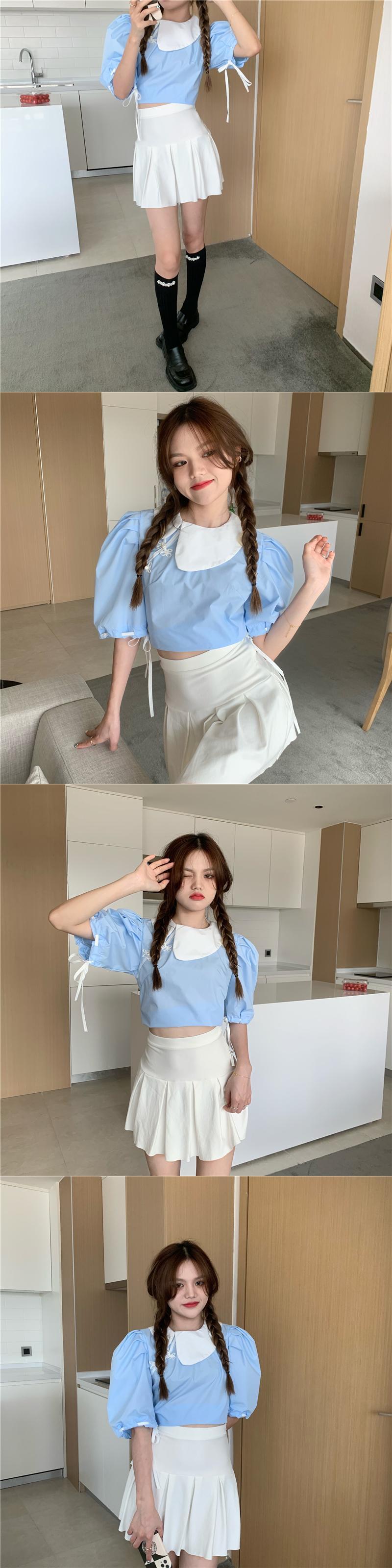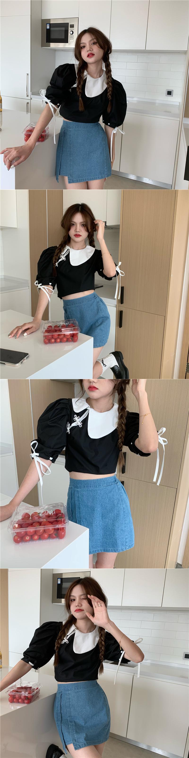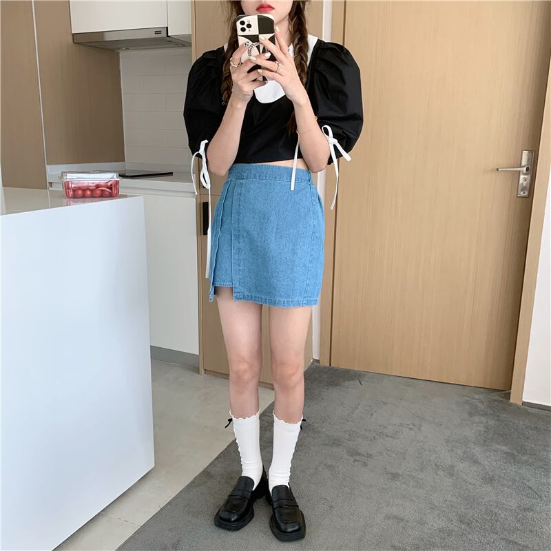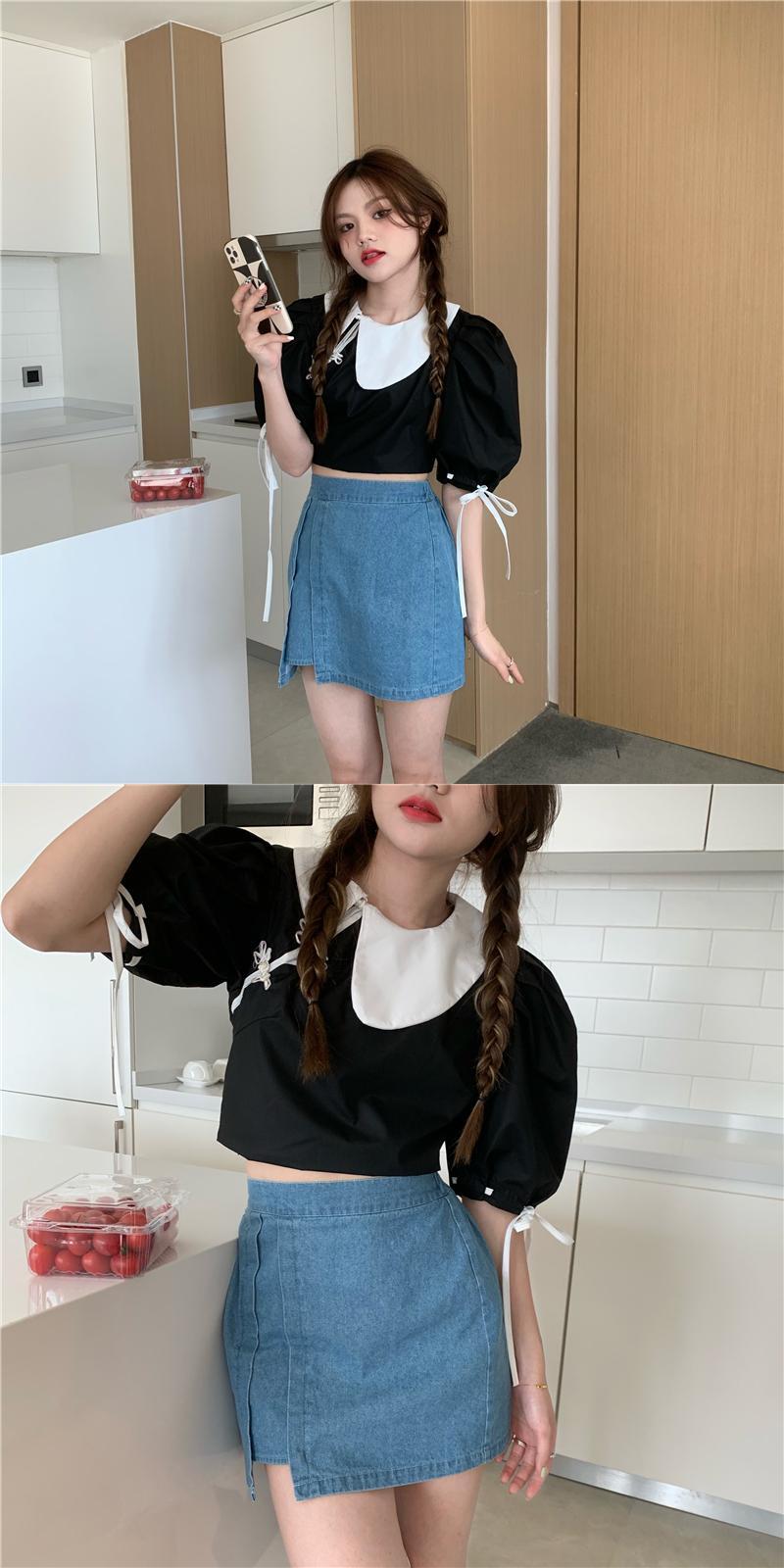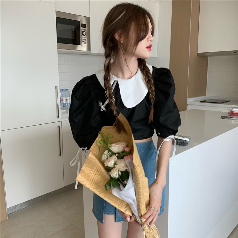 スタンダードスリーブシャツ サマールーズ薄手バックルレースブラックショートトップス レトロ 夏物 クレセントシティ5063356563
