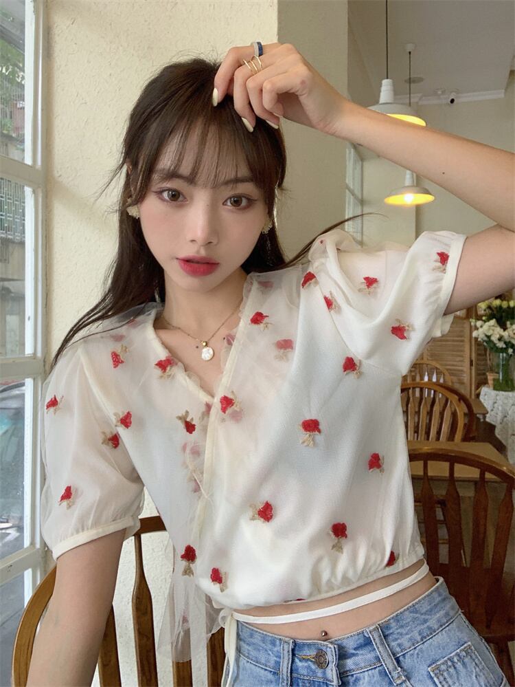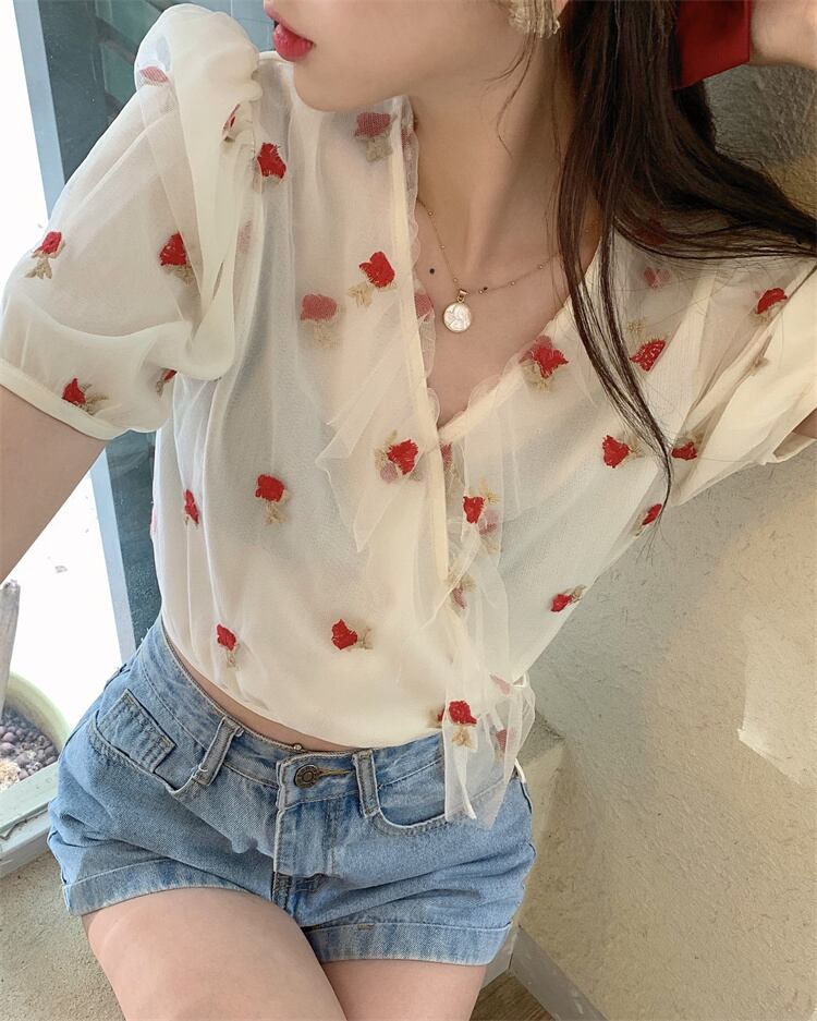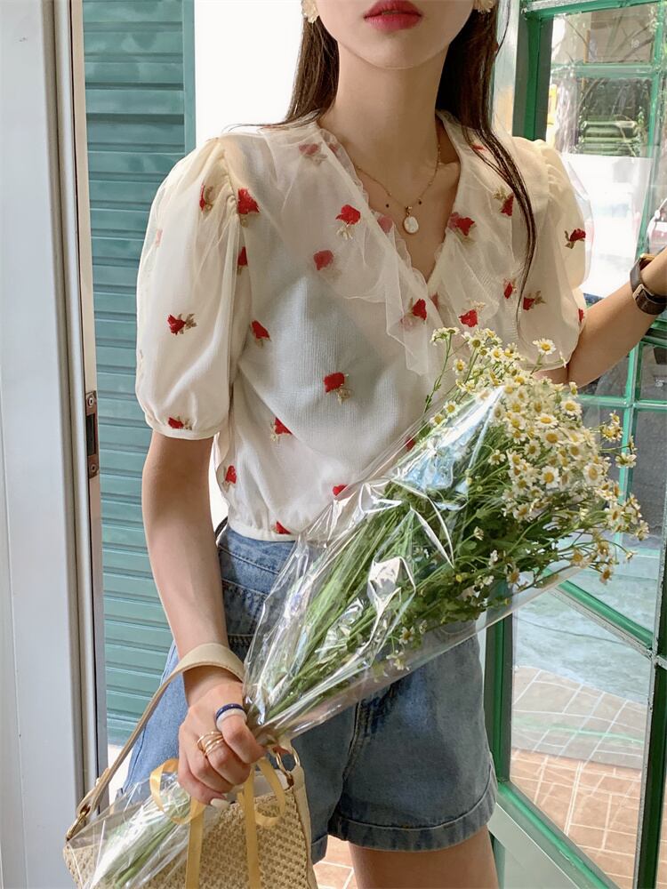 ショートスリーブシャツ サマーVネック レッド 刺繍 大人ガーリー スウィート キュート カジュアル 夏物 クレセントシティ46844981413