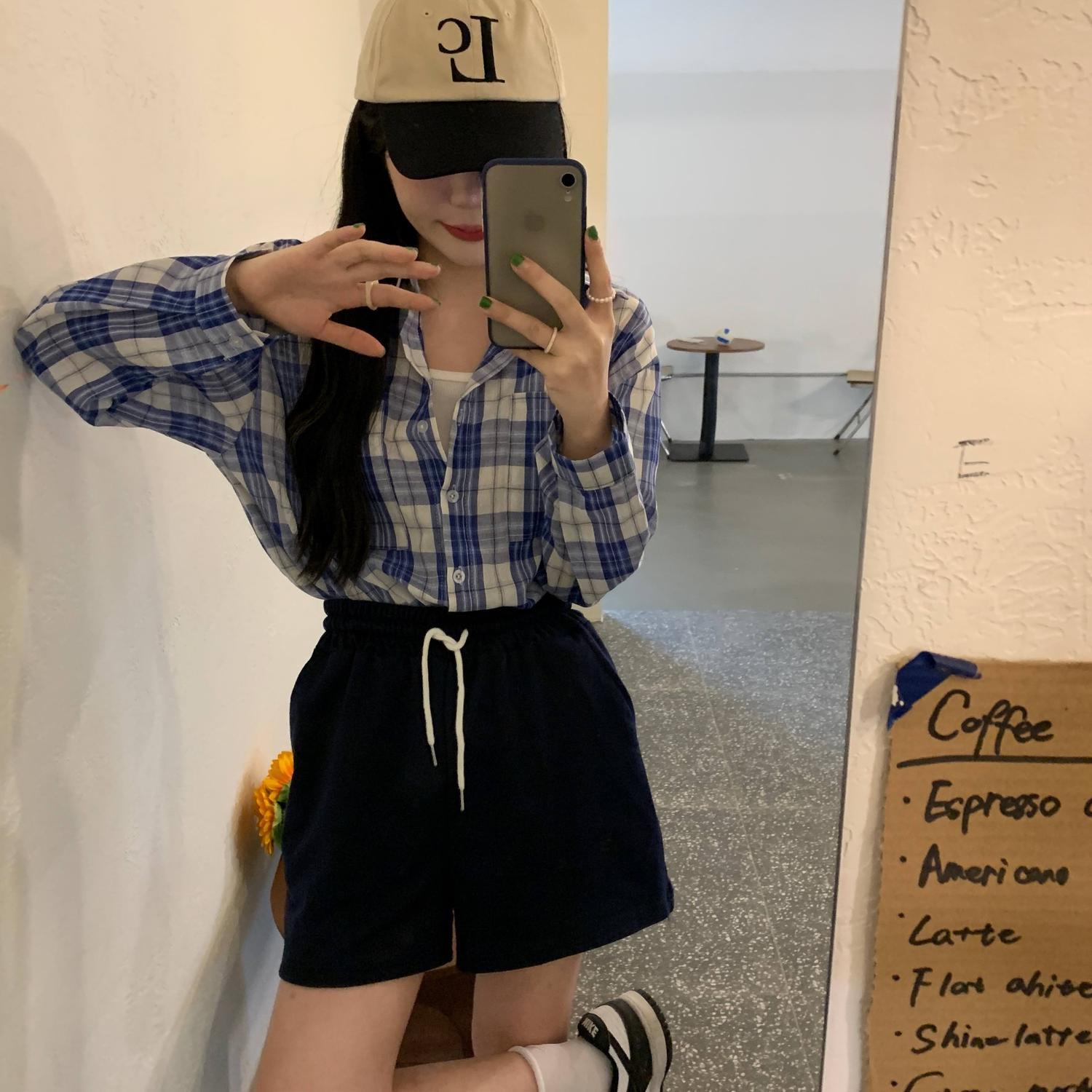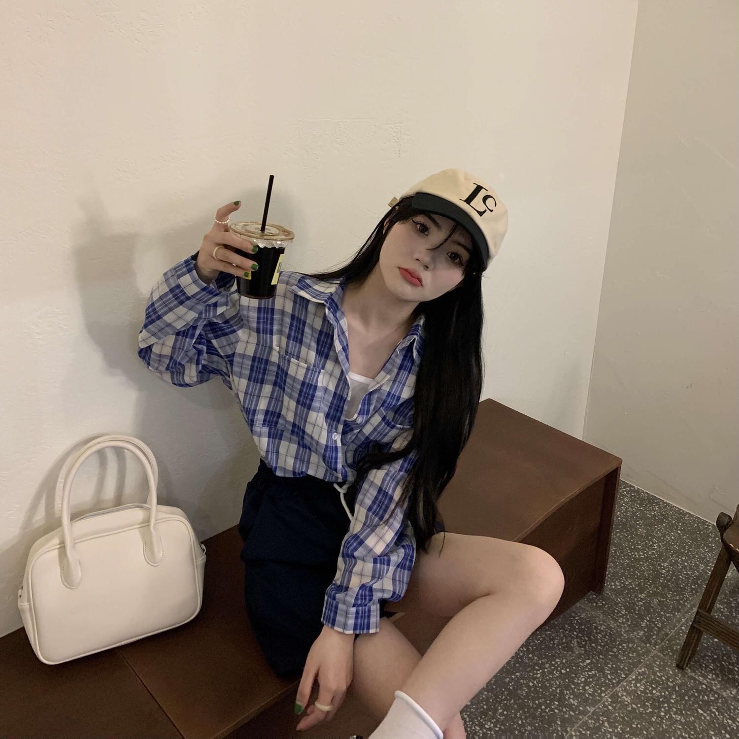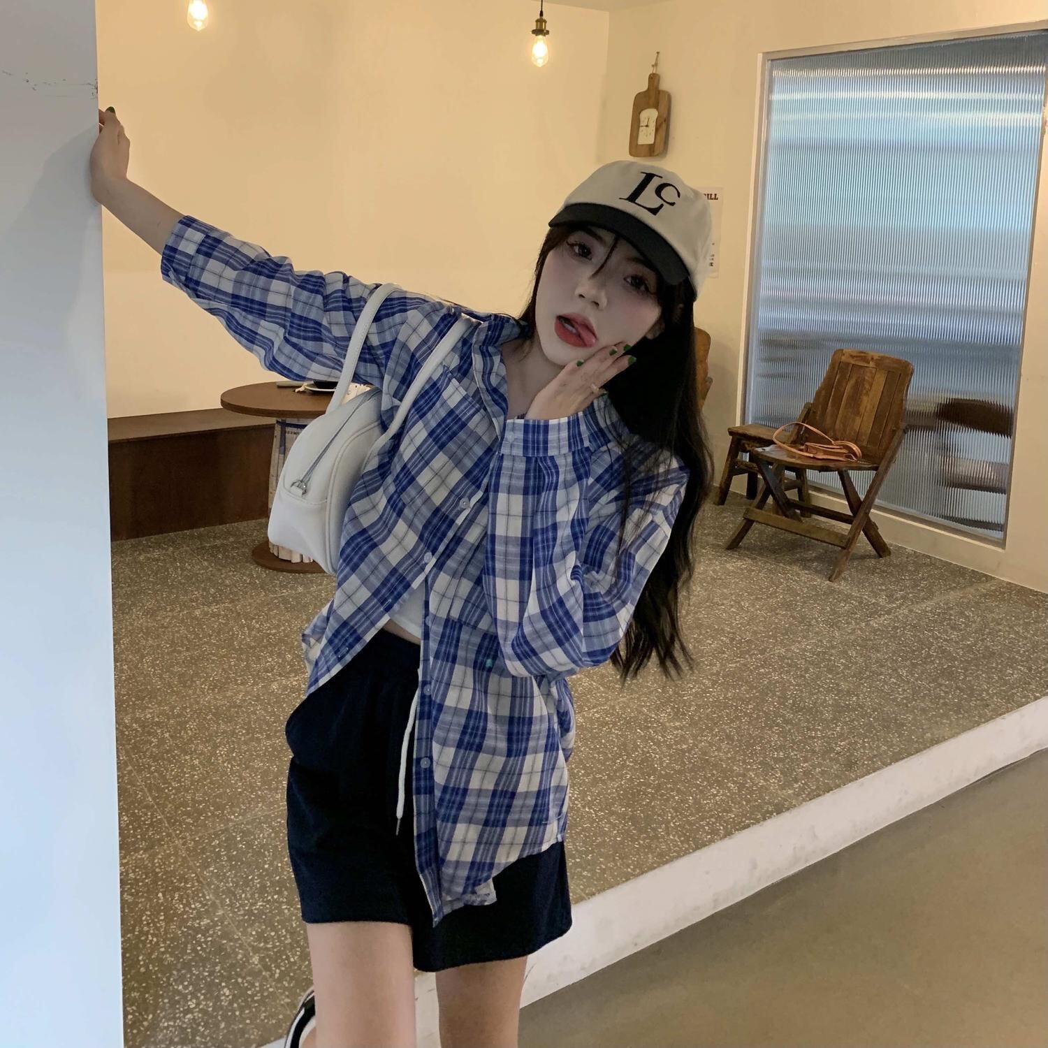 格子柄シャツ サマースタンダードカジュアルルーズ薄手 ロング レトロ 夏物 クレセントシティ88291719819