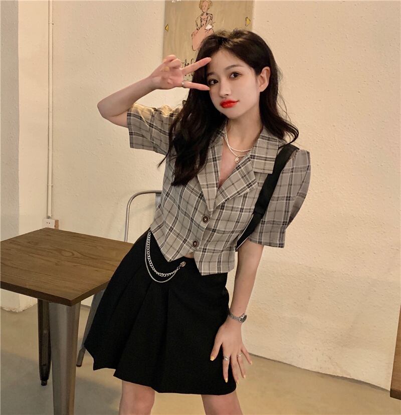チェーン ハイウェストウェストブラックプリーツショートスカート サマー薄手Aライン 夏物 クレセントシティ96419157224