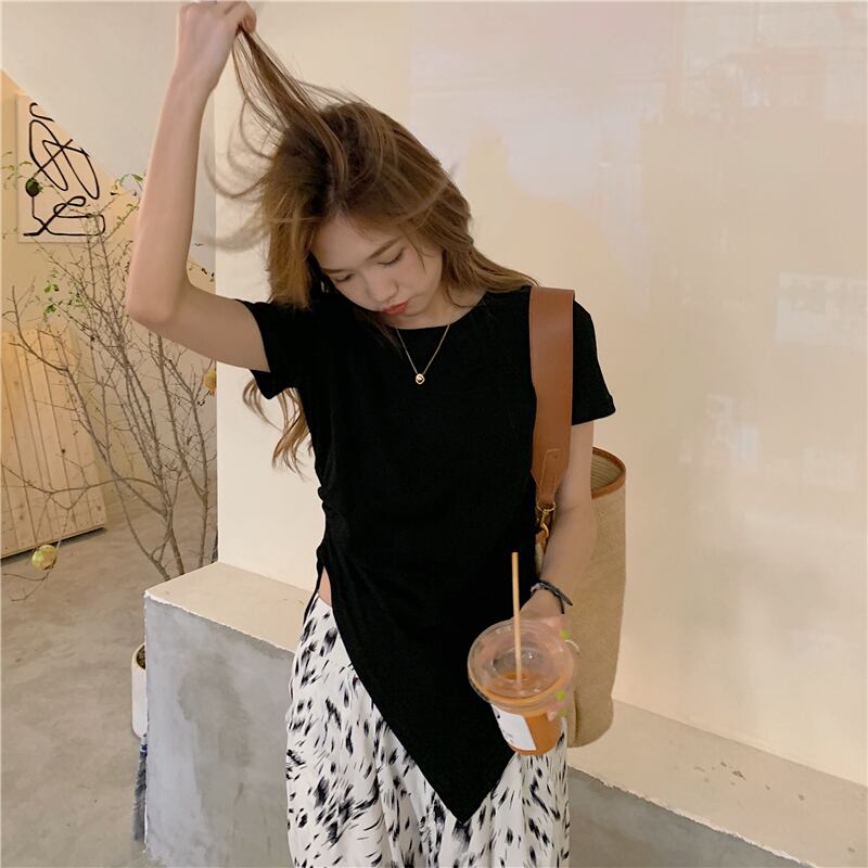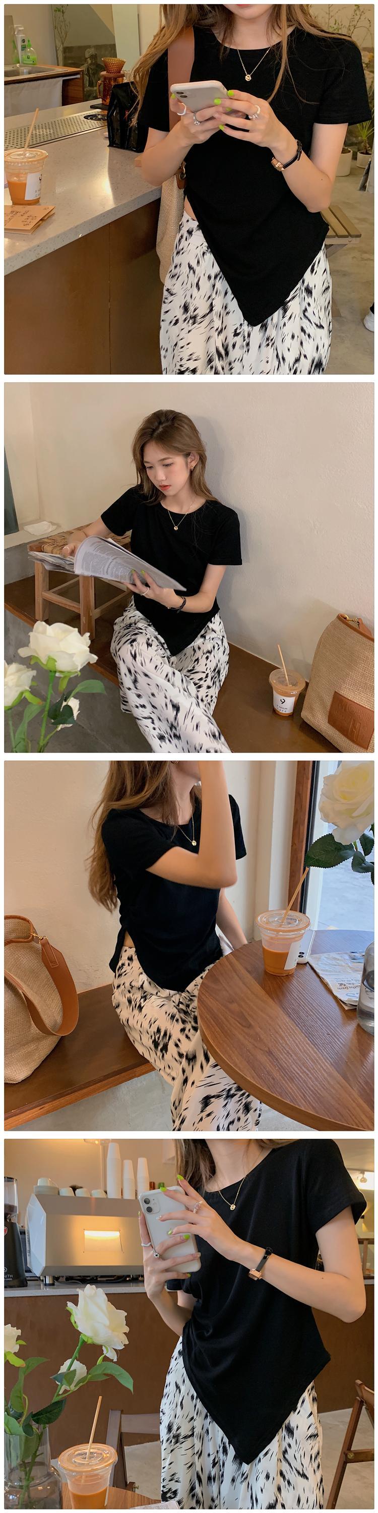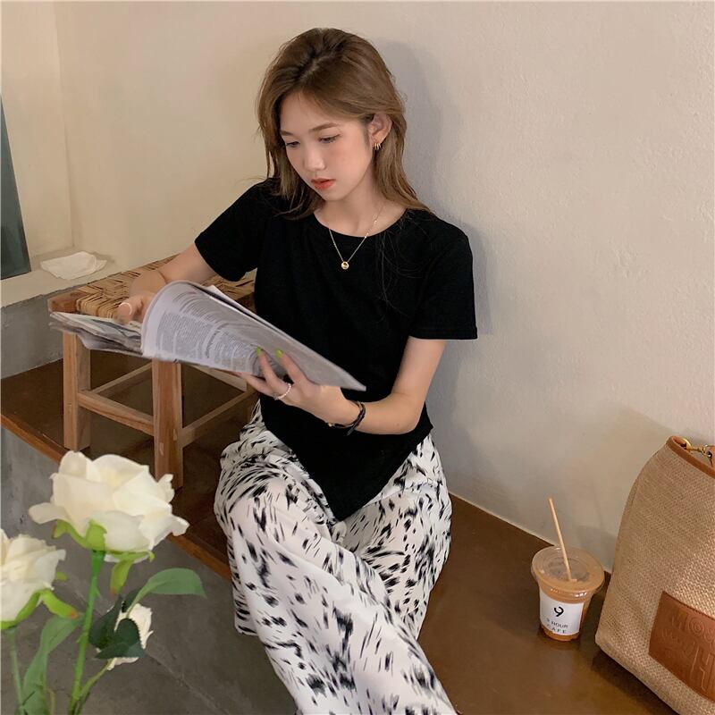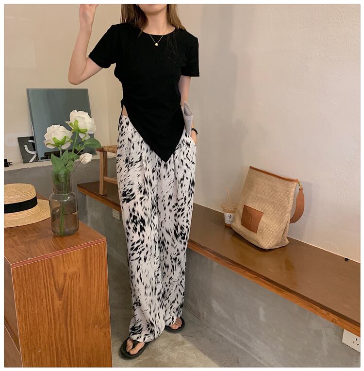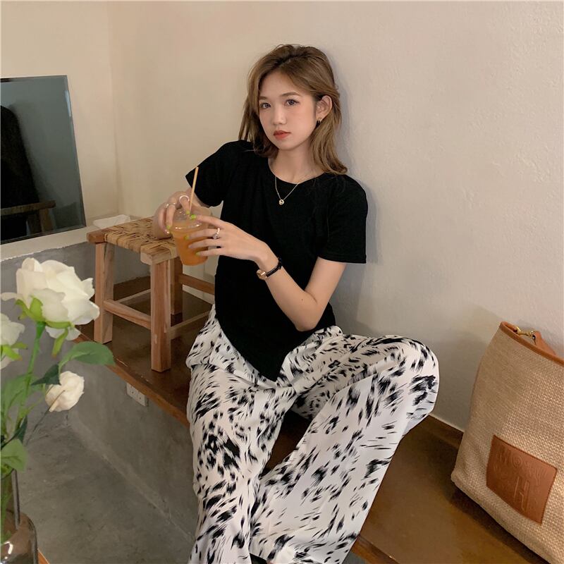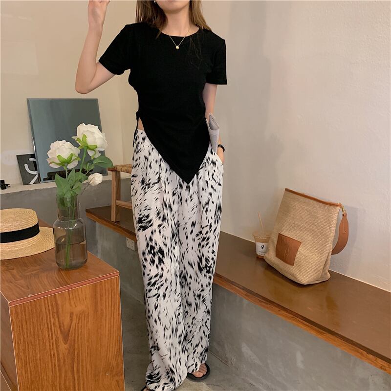 サマーブラックTシャツ レオパードプリント柄ハイウェストウェストパンツ 夏物 クレセントシティ5501252526