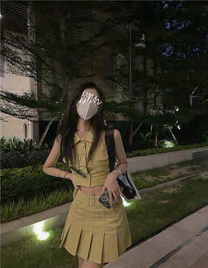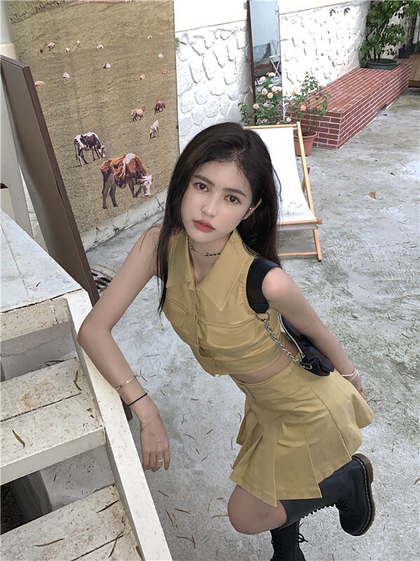 ソリッド カラーハイウェストウェストプリーツAラインスカート サマースリム 夏物 ソリッドカラー クレセントシティ18090879904