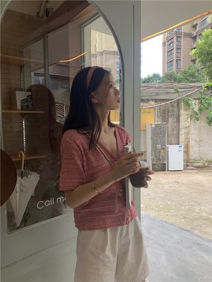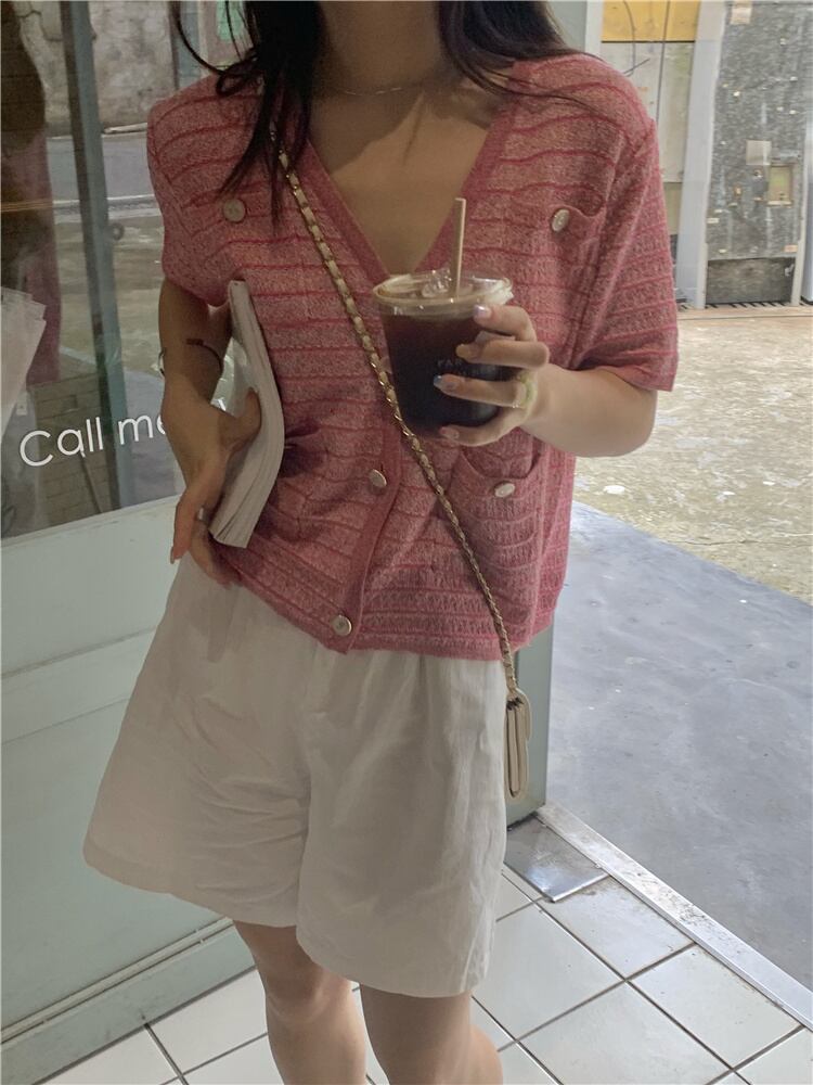 ニットカーディガンレディースサマーVネックルーズトップス ピンク 夏物 クレセントシティ28758665816