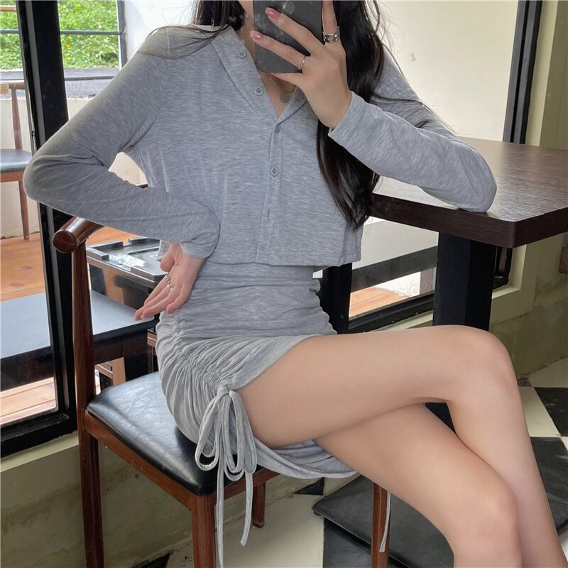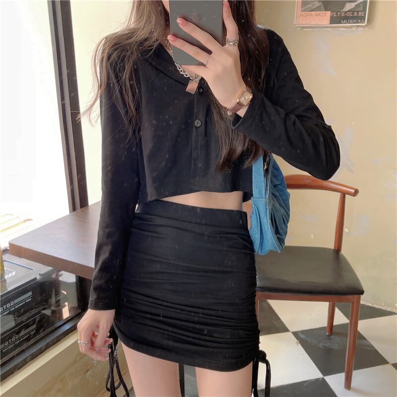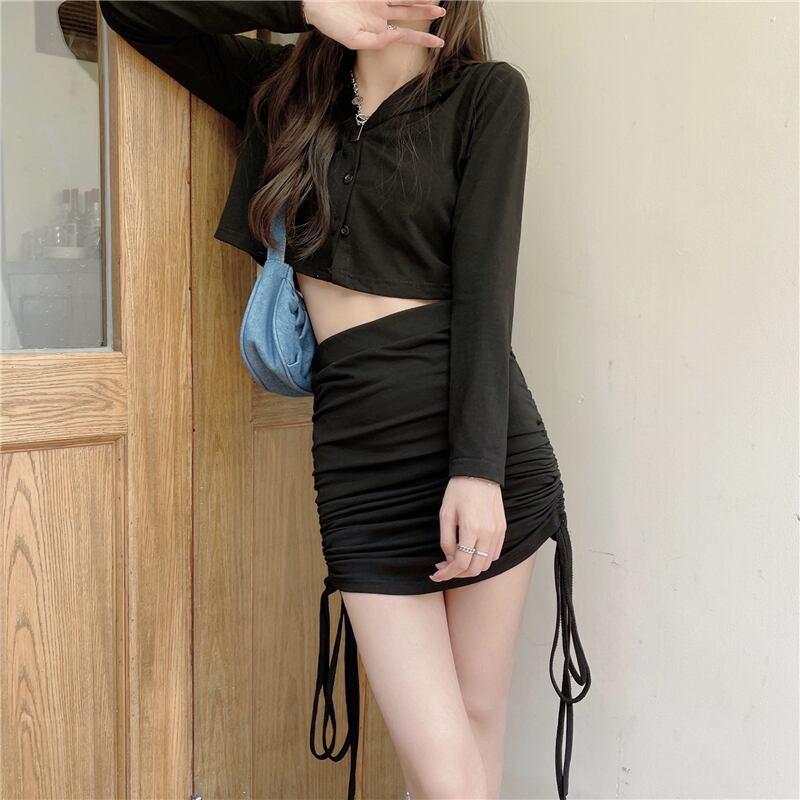 ブラックカジュアルフードショートカーディガントップス レディースハイウェストウェストギャザースカート クレセントシティ9900119093
