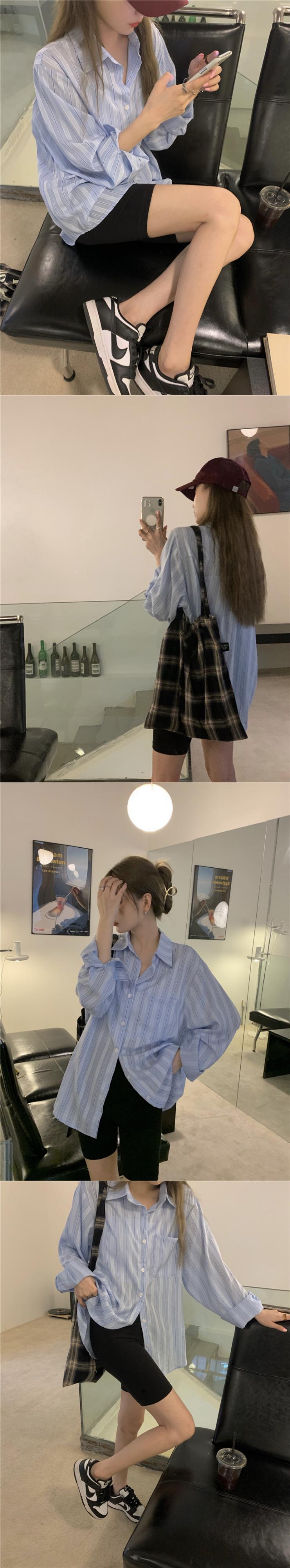 サマーブルーストライプシャツ レディースルーズ薄手カーディガンジャケット ロング 夏物 クレセントシティ69756432573