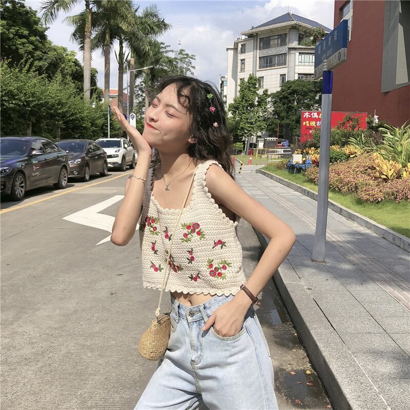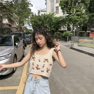 ショートサマールーズ薄手ニットトップス レッド 刺繍 夏物 クレセントシティ96303914775
