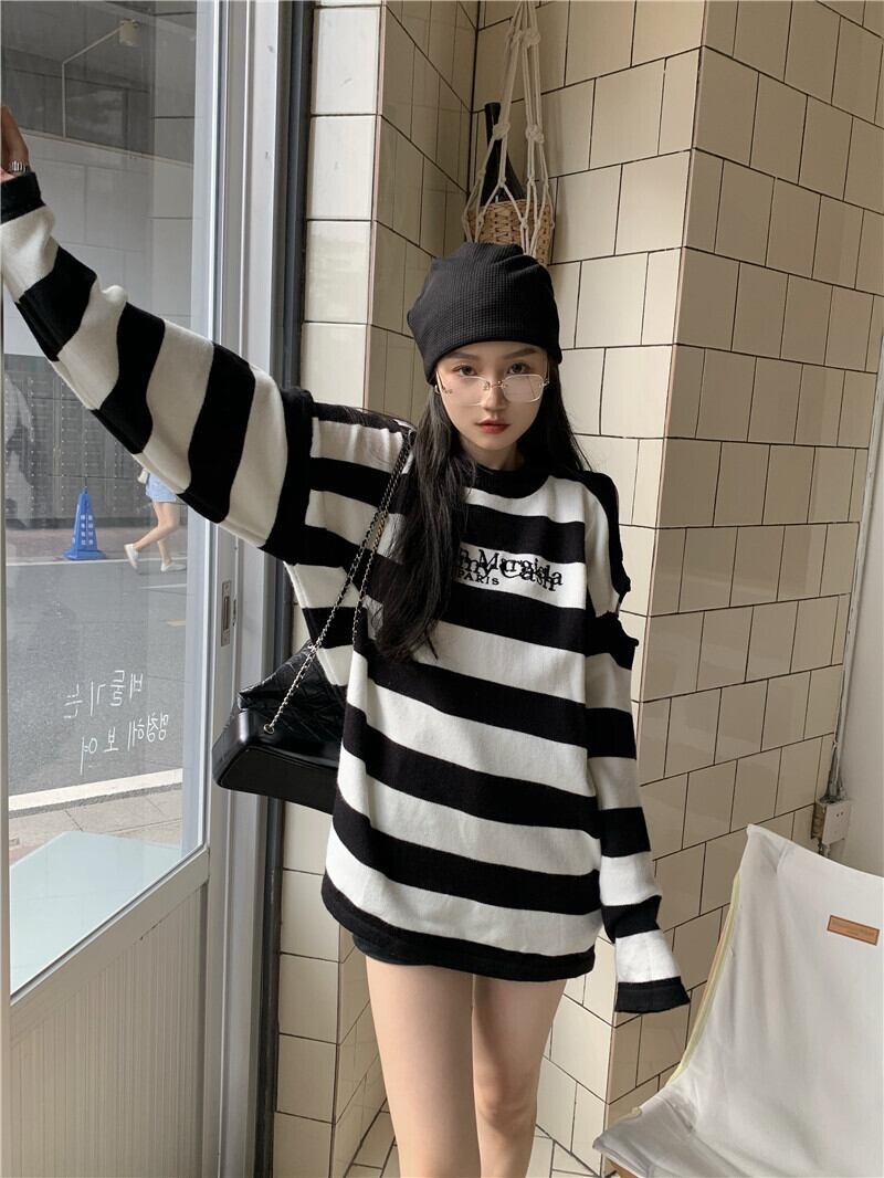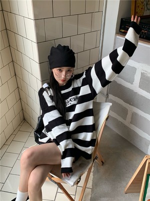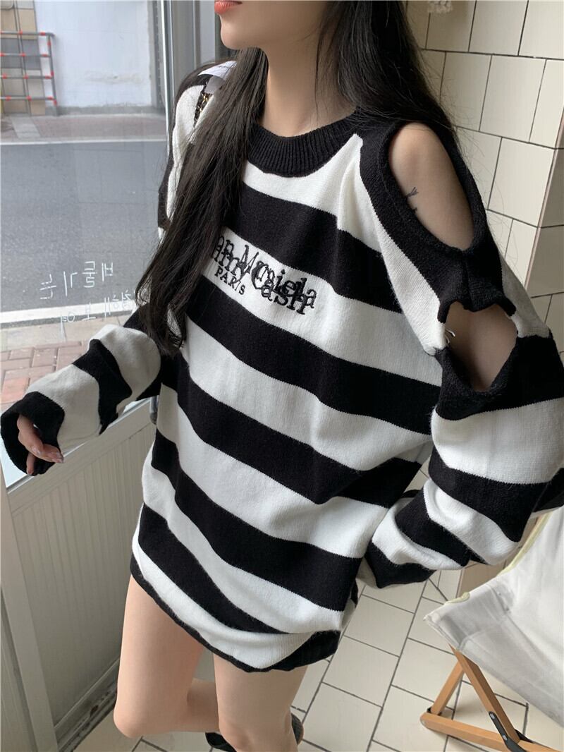 スタイルストライププルオーバー セーター ルーズ薄手ニットトップス ロング オフショルダー クレセントシティ28920733121