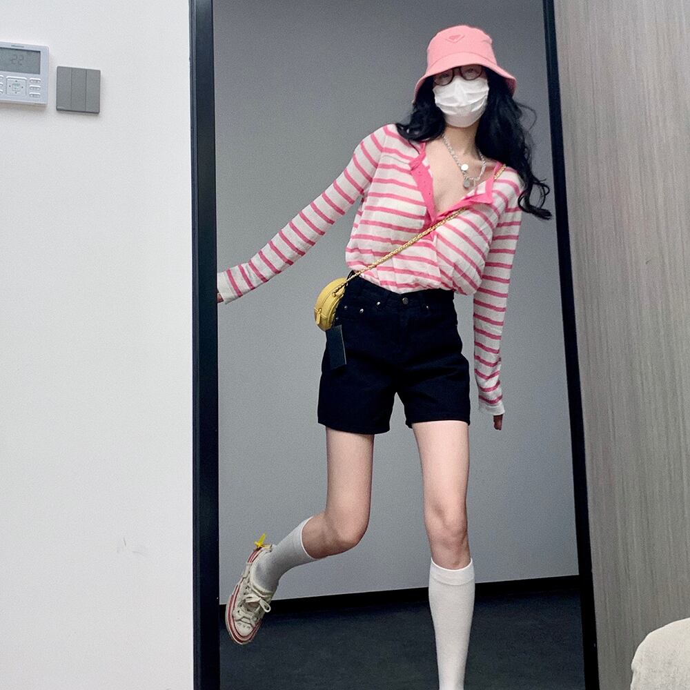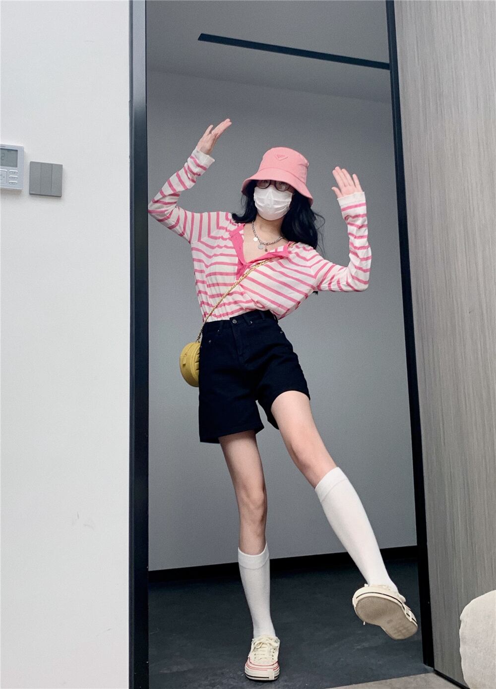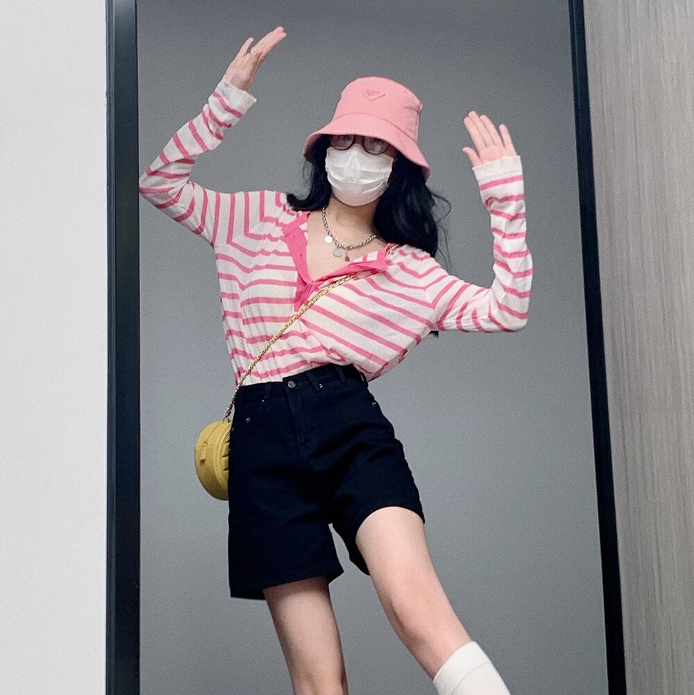 ストライプTシャツ シャツ オータムルーズ薄手ニット長袖スリーブトップス ロング ピンク 秋物 クレセントシティ2751379107