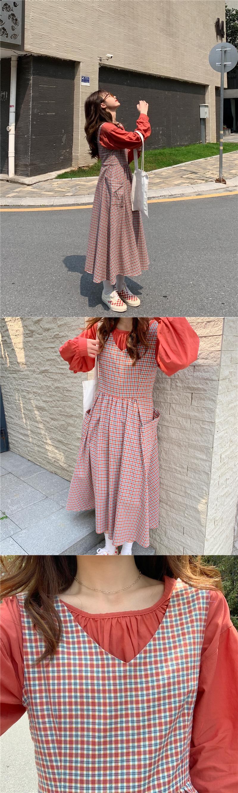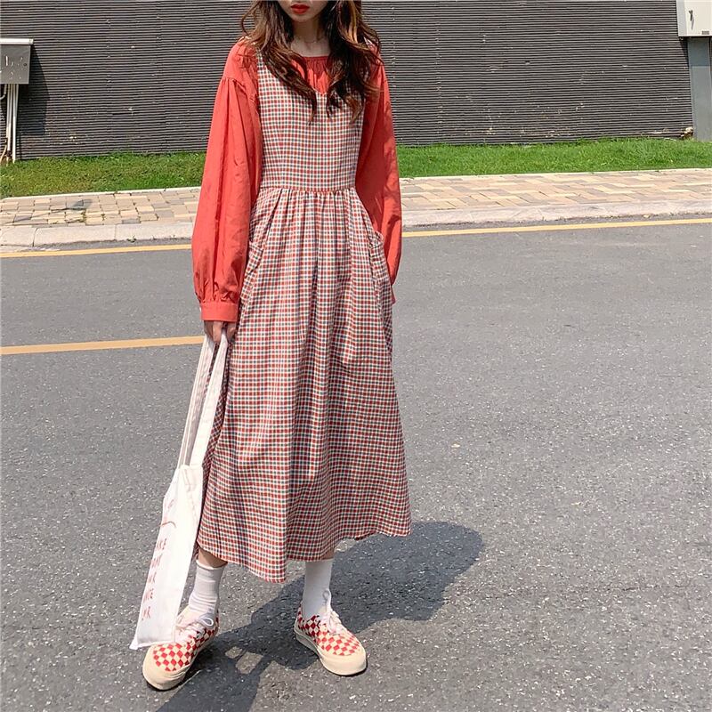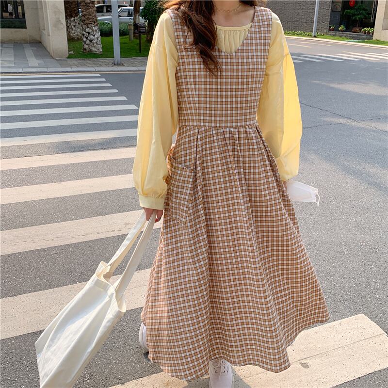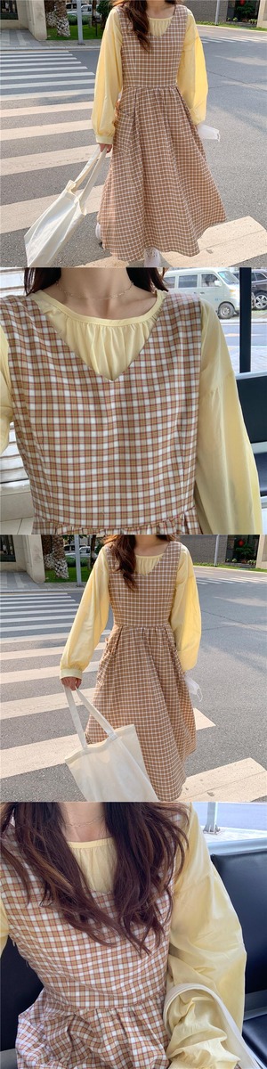 イエロールーズスリーブシャツ オータムロング格子柄ドレス ランタンスリーブ 秋物 クレセントシティ51481412051
