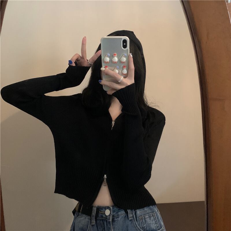 ショートフードジャケット オータムスリムニットカーディガンストライプトップス ロング 秋物 クレセントシティ30617466539