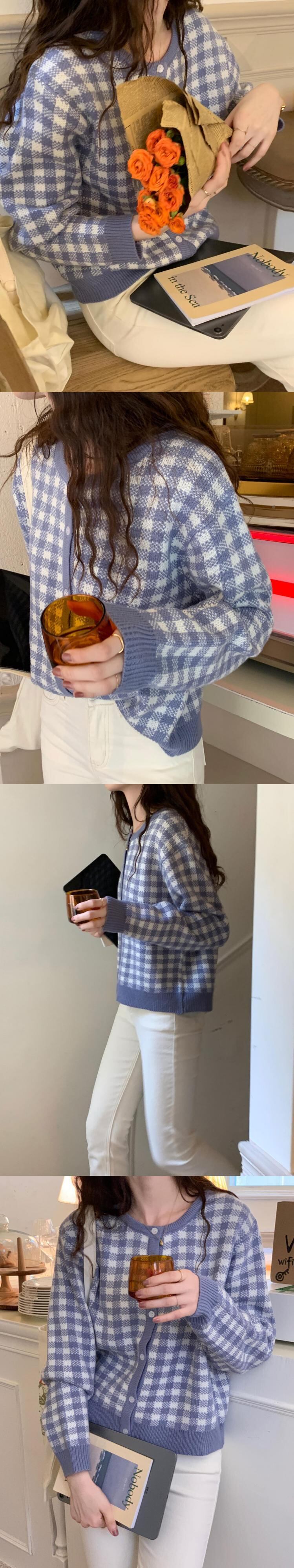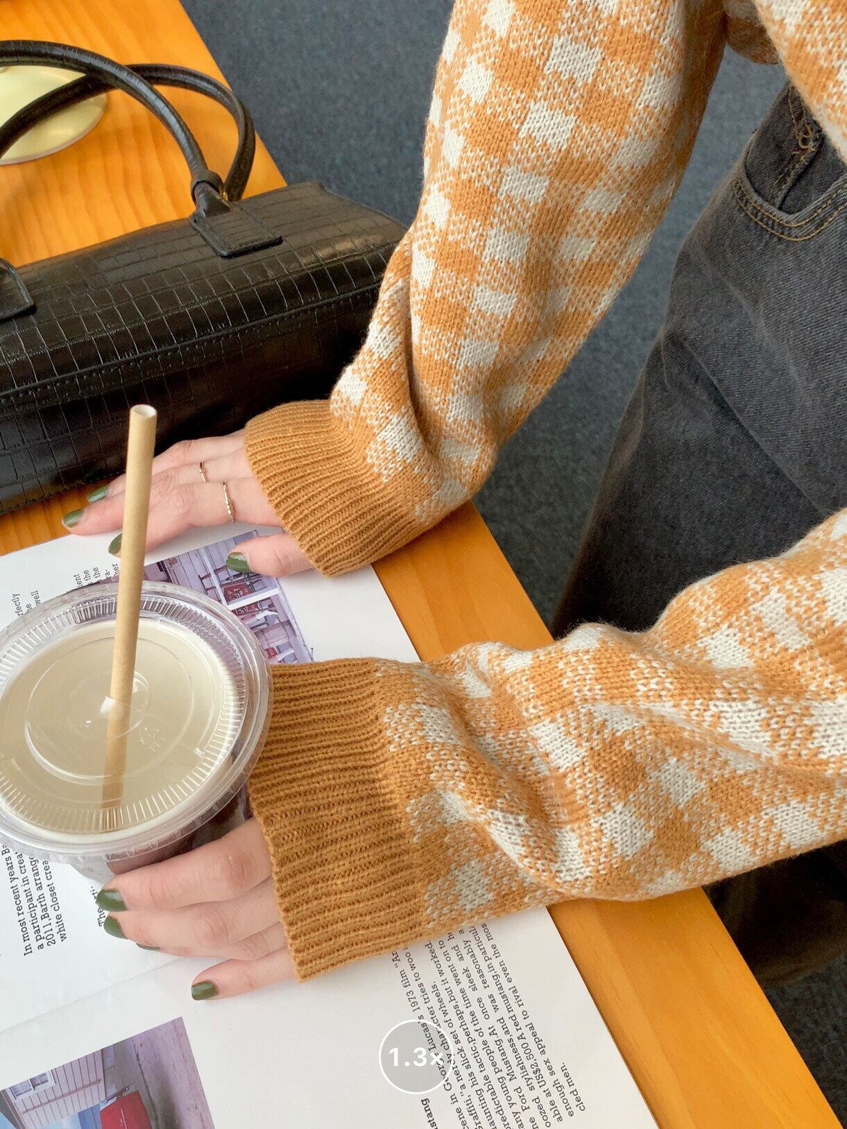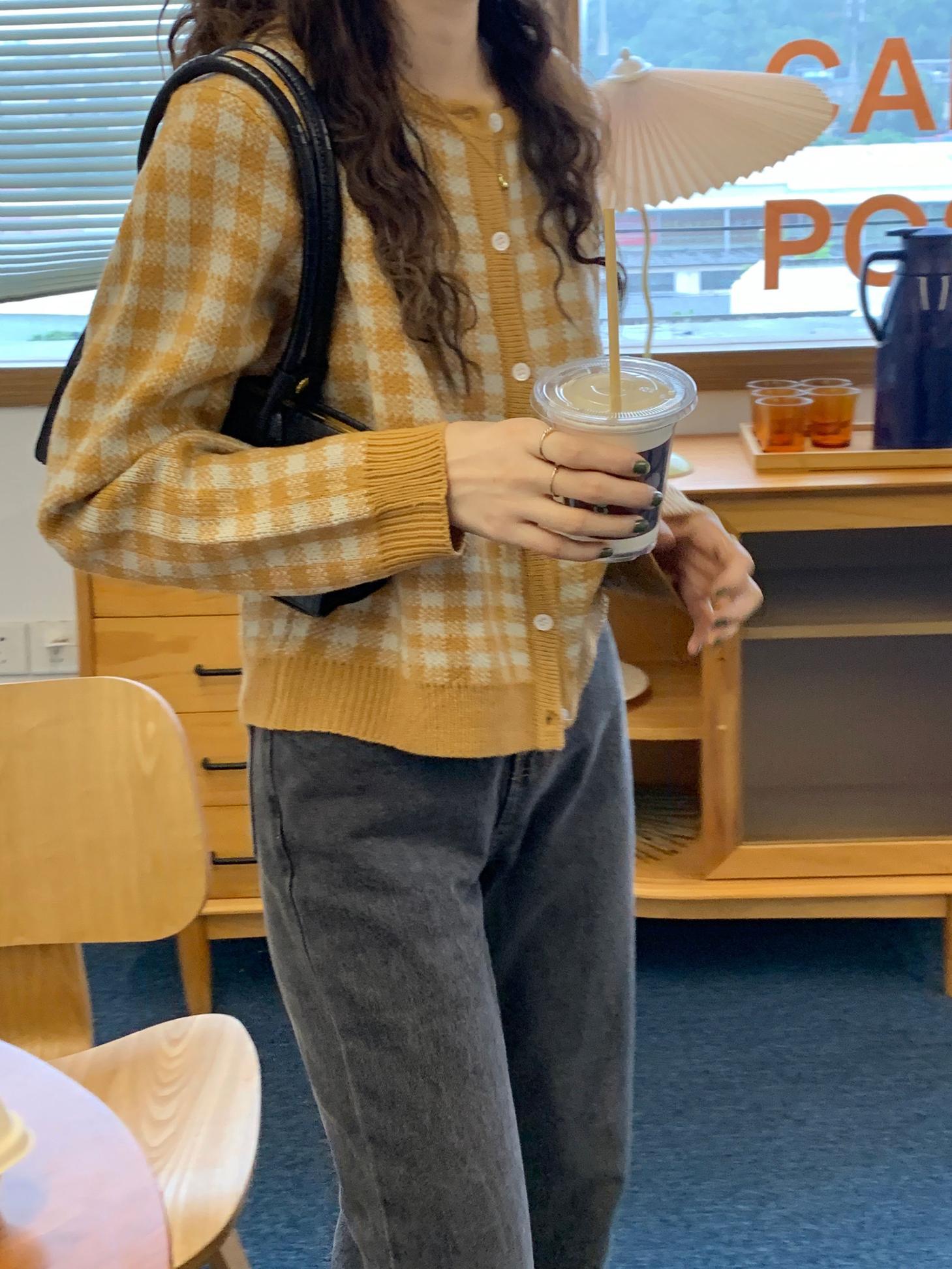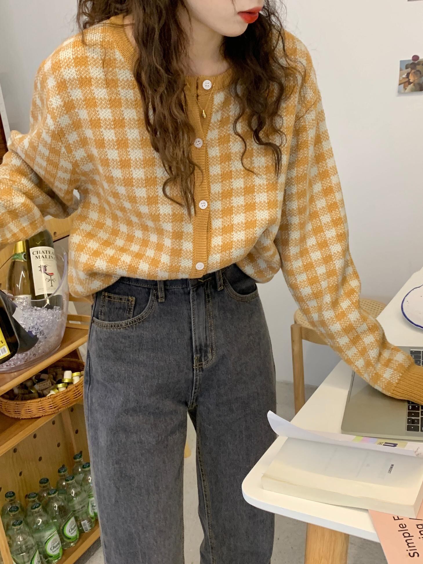 格子柄ニットカーディガンオータムスタイルルーズセーター コート ピンク 秋物 クレセントシティ46907853278