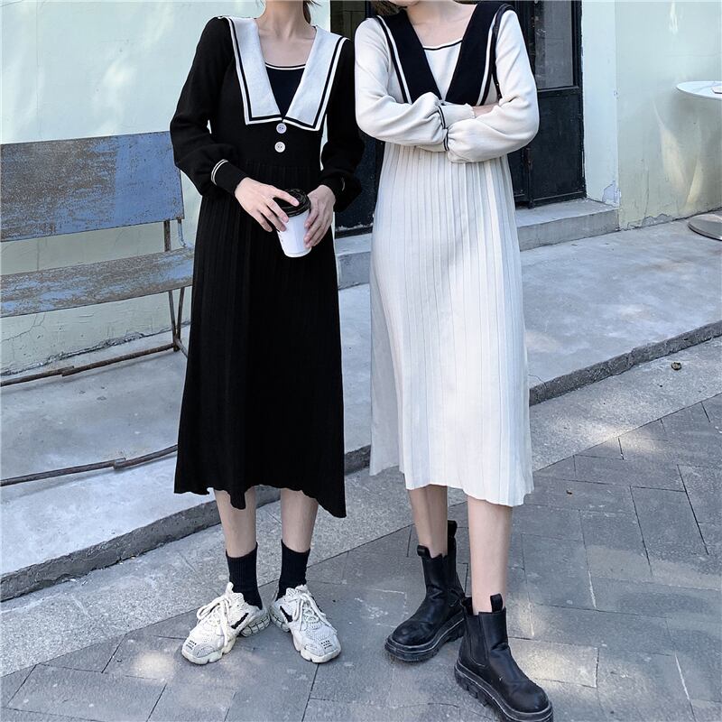 スタンダードネイビーカラードレス オータムニットスカート スタイルウェストAライン レトロ 秋物 クレセントシティ18865572689