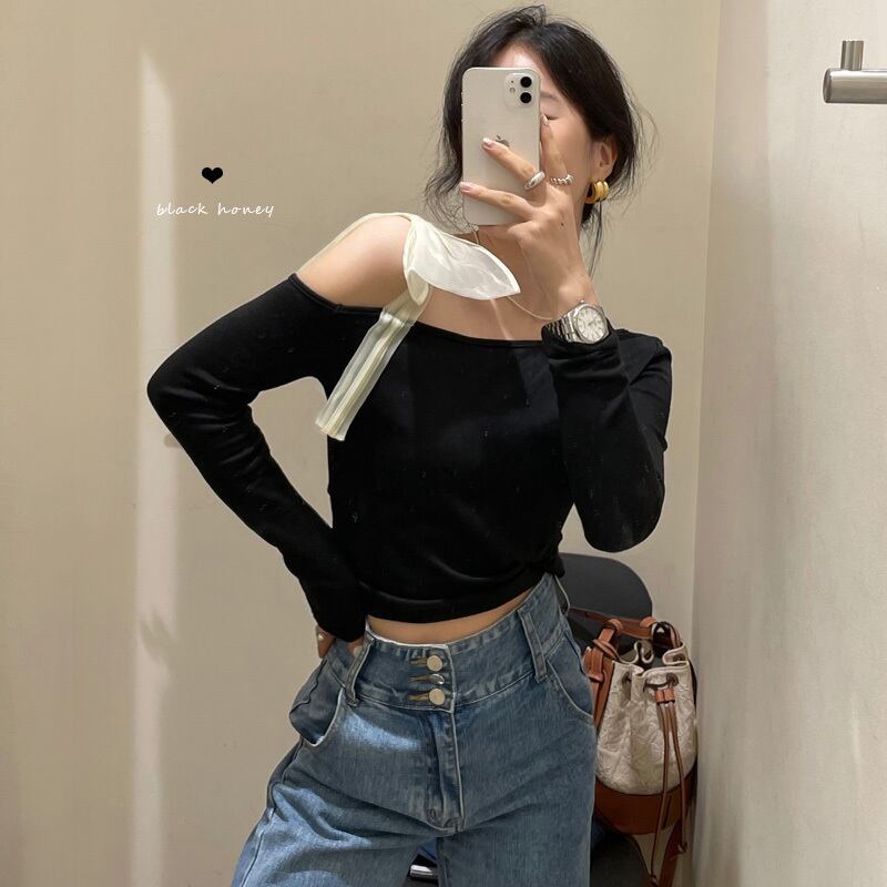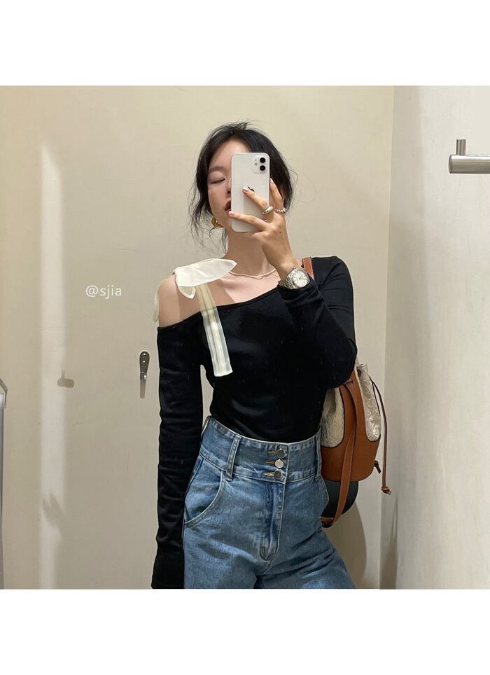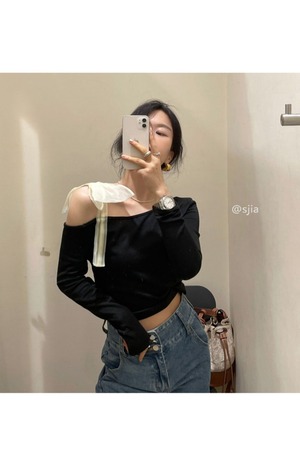 Tシャツ オータムスリムブラックブラウス ロング リボン 秋物 クレセントシティ39789895453