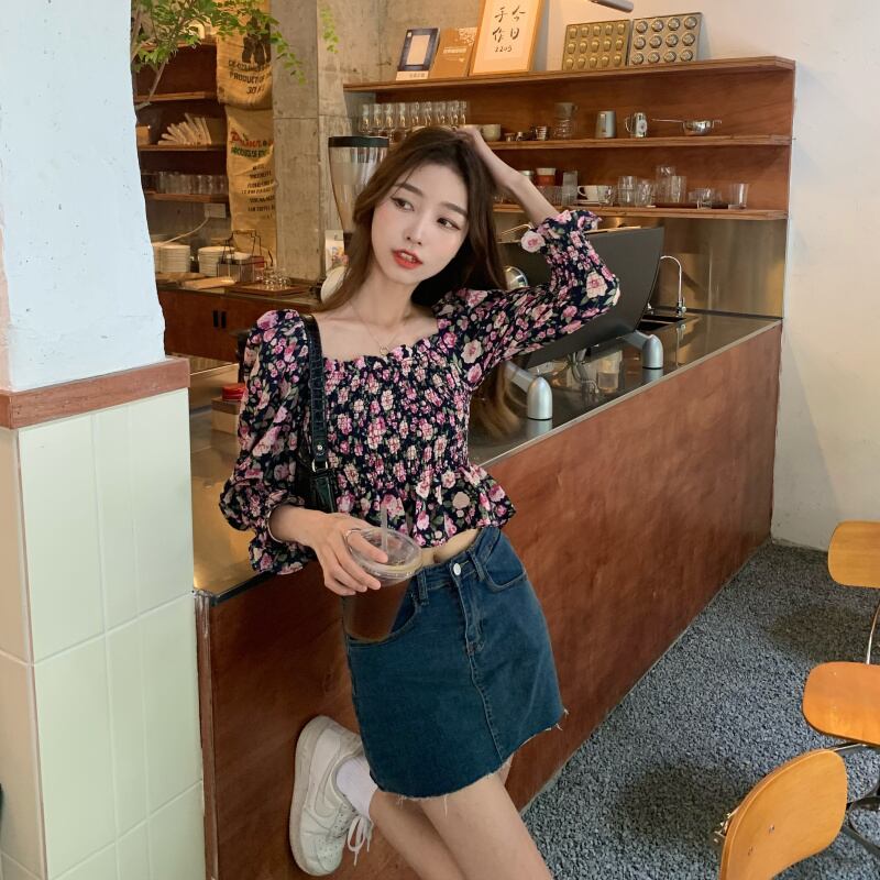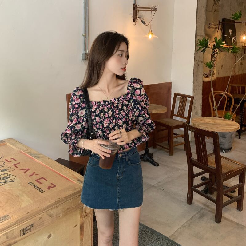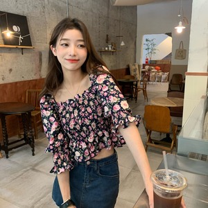 スリーブフローラルシャツ サマーショートクロップドシフォントップス 夏物 花柄 スクウェア クレセントシティ93578672293
