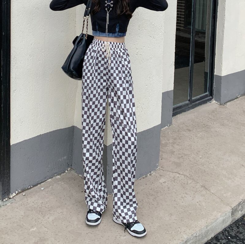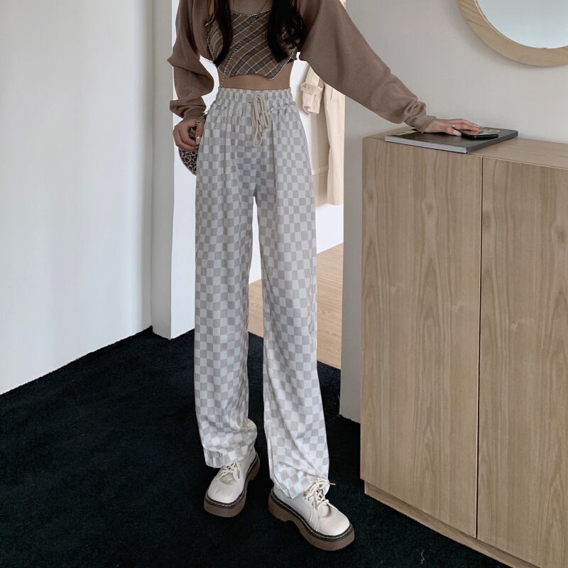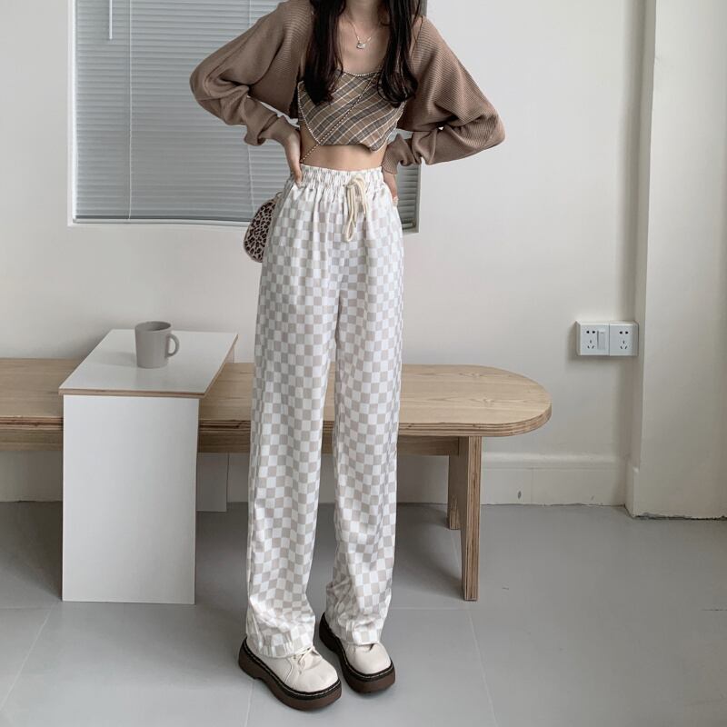 格子柄カジュアルパンツ オータムストレッチウェストルーズ薄手ハイウェストワイドレッグ エラスティック 伸縮 秋物 ワイドパンツ クレセントシティ82937500731