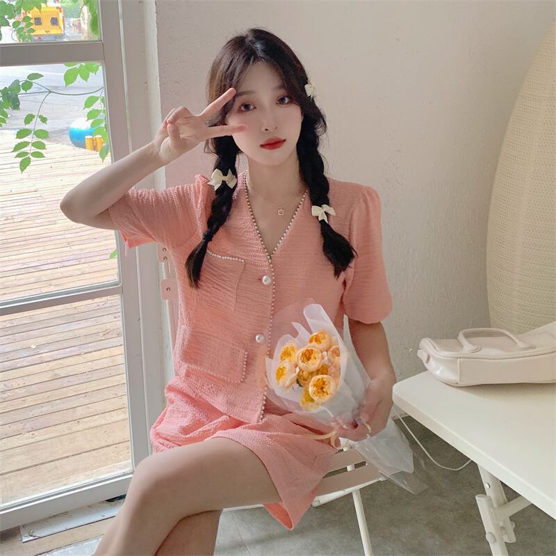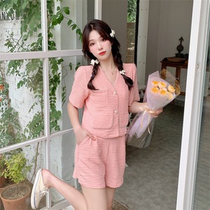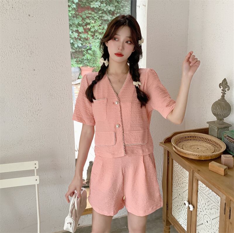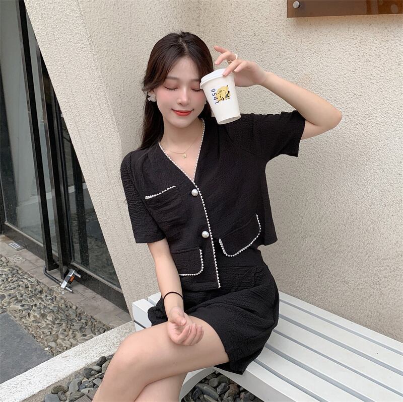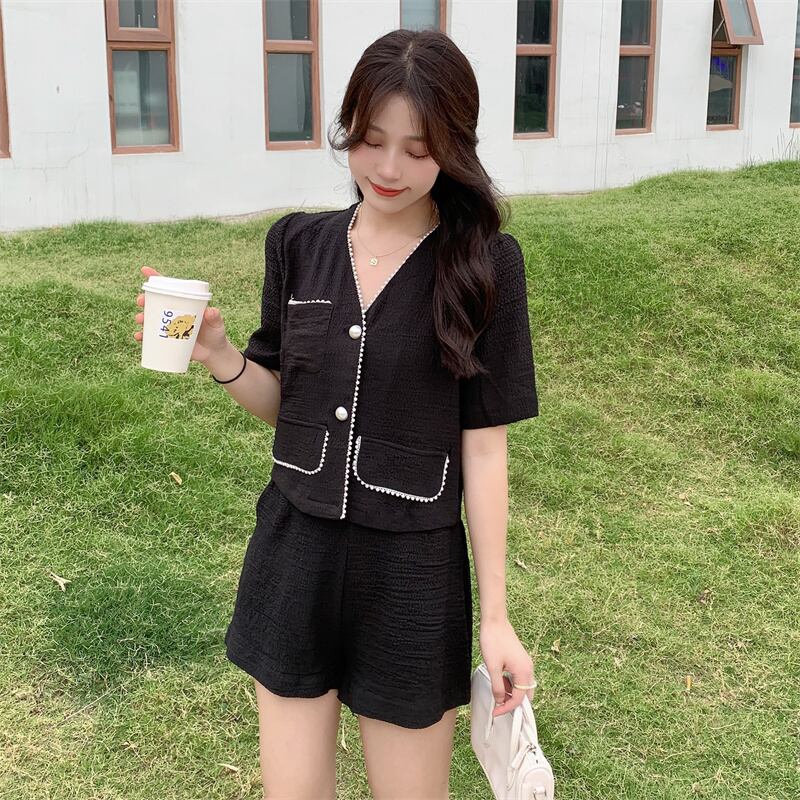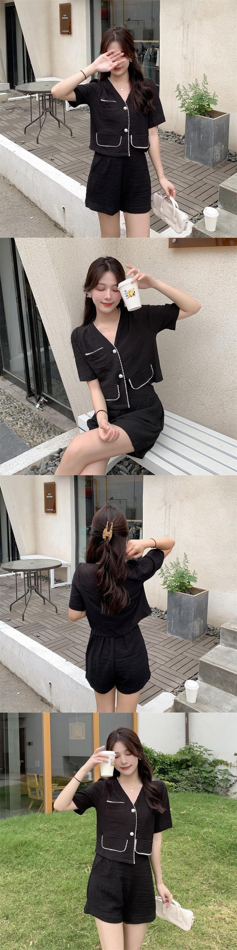 サマーブラックワイドレッグショーツ レースVネックルーズカーディガントップス 夏物 ブルマー ワイドパンツ クレセントシティ73755869716