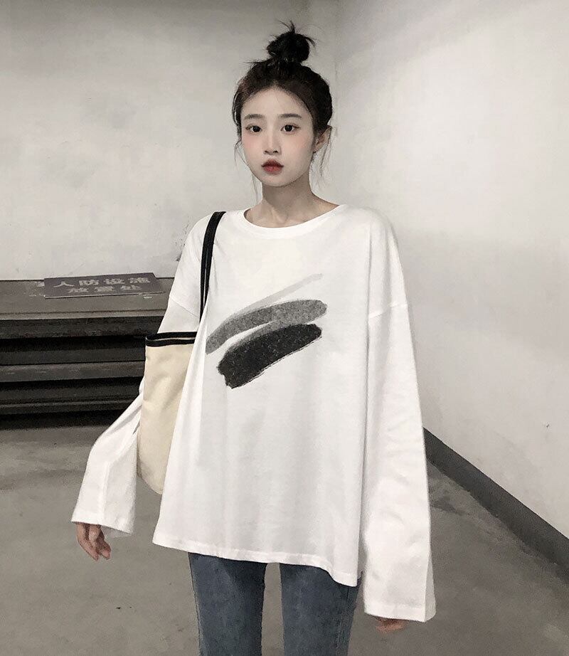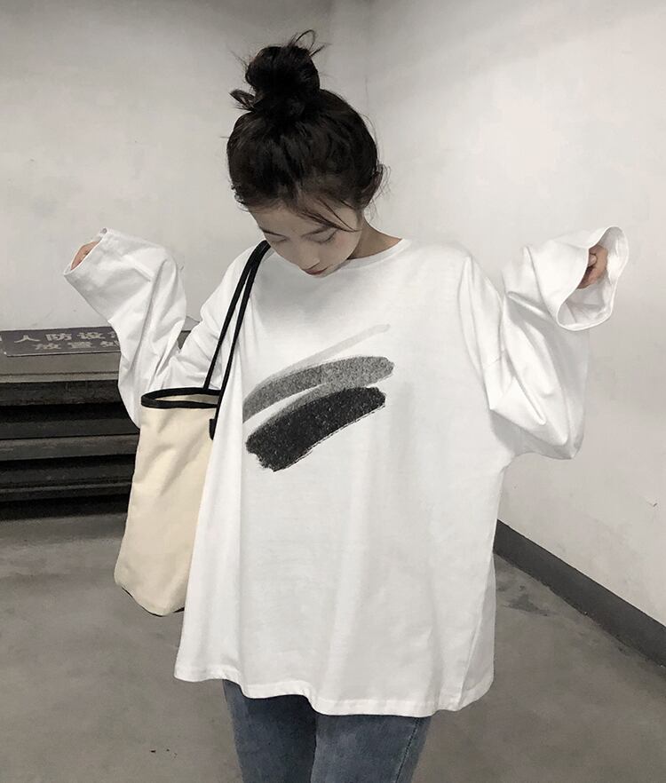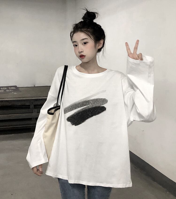 プリントTシャツ シャツ オータムカジュアル薄手ルーズホワイトトップス ロング 秋物 クレセントシティ93620050823